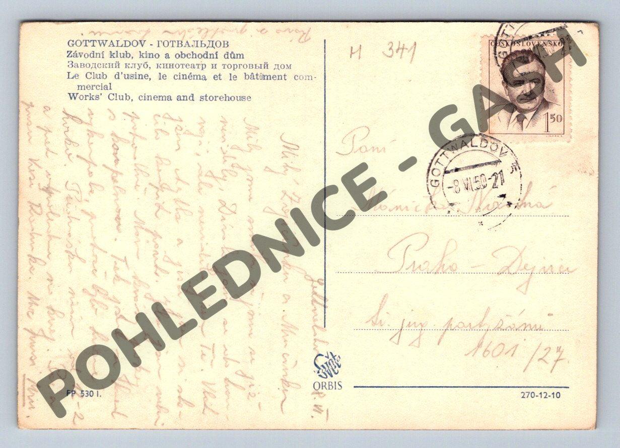 Pohlednice zachycuje pohled na město Gottwaldov (dnes Zlín) s dominantní budovou Závodního klubu, kina a obchodního domu. Tato budova je významnou architektonickou památkou průmyslového města a ukázkou modernistické výstavby z období 20. století. Na zadní straně najdeme vícejazyčný popis objektu ve čtyřech jazycích, ručně psaný vzkaz, adresu a poštovní známku se známým razítkem Gottwaldov z roku 1951. Jedná se o sběratelsky zajímavý exemplář vhodný pro milovníky historie Moravy a architektury meziválečného období.