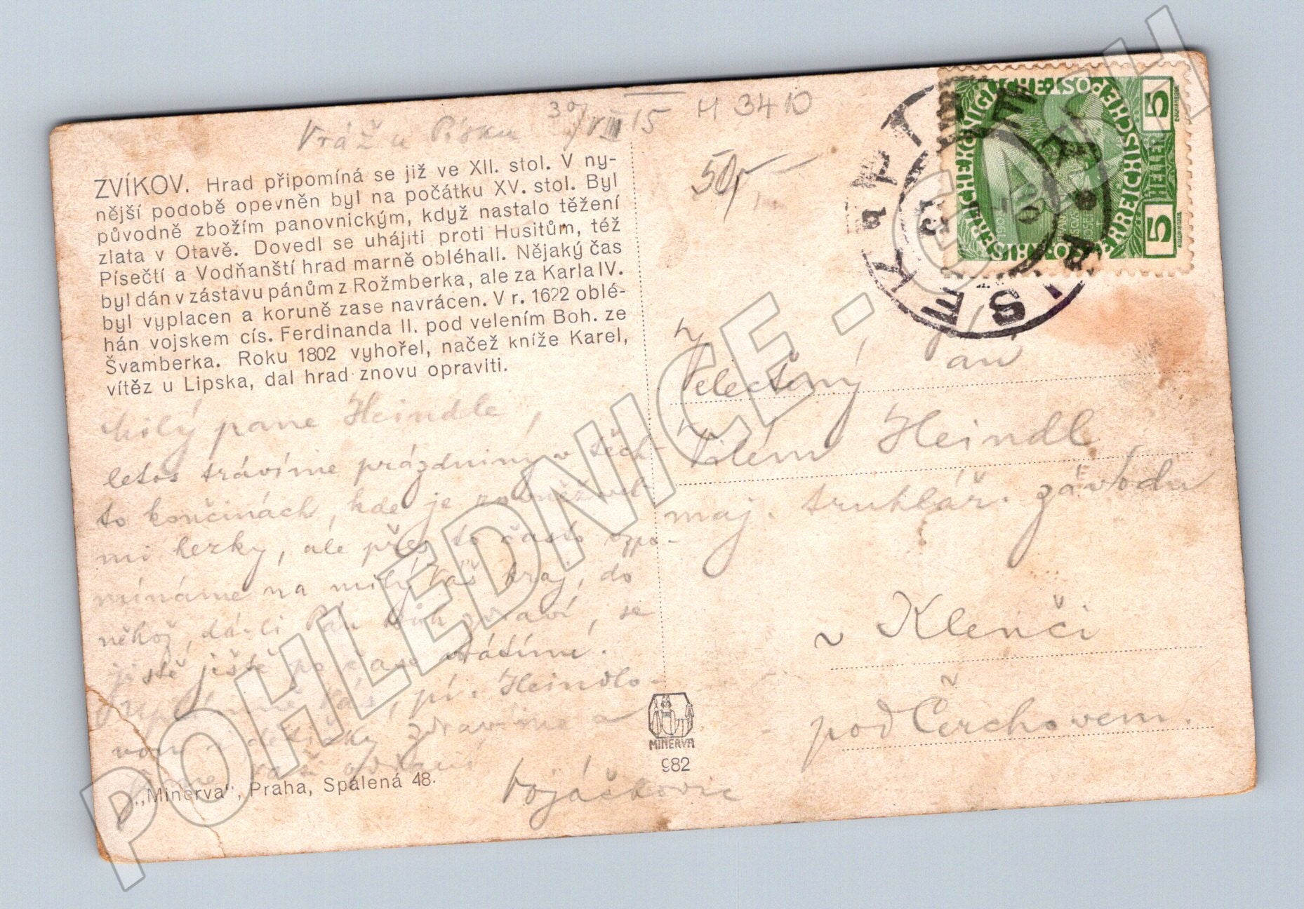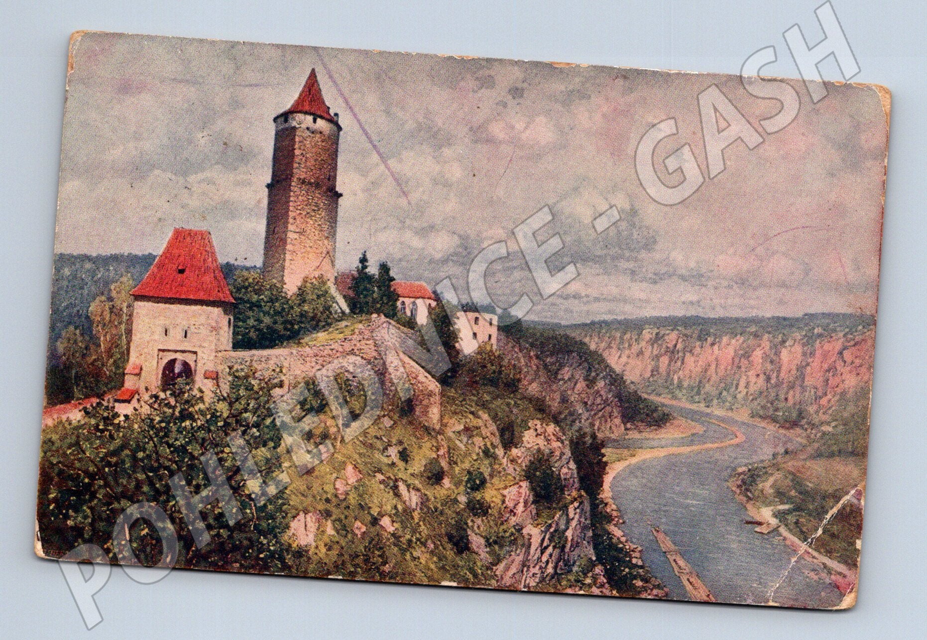 Starší pohlednice s vyobrazením hradu Zvíkov, který se nachází u soutoku řek Vltavy a Otavy. Na lícové straně je krásně kolorovaná ilustrace hradu s mohutnou věží a okolní krajinou. Na zadní straně je tištěný popis historie hradu Zvíkov, doplněný ručně psaným pozdravem a adresou. Pohlednice byla odeslána, je opatřena známkou a razítkem z doby Rakouska-Uherska. Výrazné známky stáří: mírné rohy, drobné oděrky a zašpinění, avšak zachovalý sběratelský kus s historickou hodnotou.