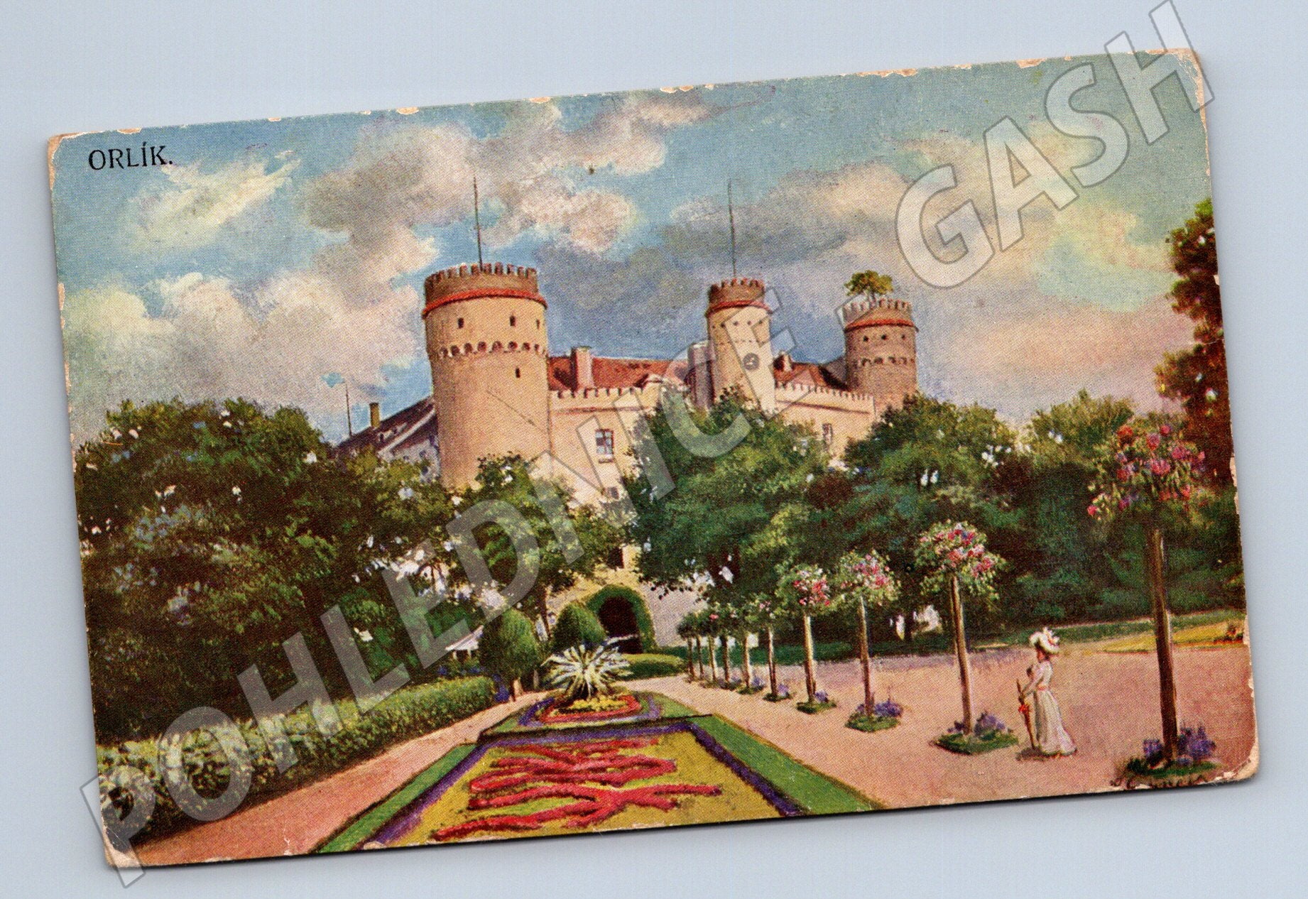 Originální historická pohlednice se zámkem Orlík. Na přední straně je barevná ilustrace slavného zámku obklopeného rozkvetlou zahradou, v popředí se prochází elegantně oděná dáma. Pohlednice nese kouzlo starých časů a zachycuje krásu architektury i přírody v okolí zámku Orlík. Na zadní straně je rukopisné věnování, datum 4.8.21 a zřetelně patrné známky stáří. Jedná se o velmi dekorativní sběratelský kousek vhodný do každé sbírky historických pohlednic či tematicky zaměřené na hrady a zámky. Stav odpovídá stáří, viz foto.