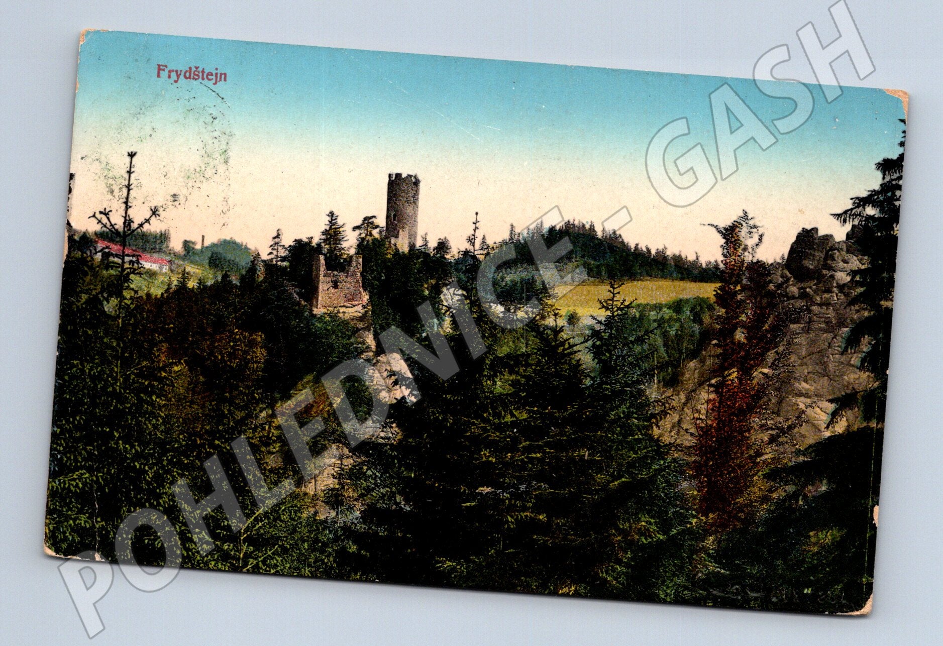 Starobylá pohlednice s motivem hradu Frýdštejn v Českém ráji. Pohlednice je částečně kolorovaná, na přední straně je krásně zachycen hrad obklopený skalami a lesy. Na zadní straně je ručně psaný text, známka a původní poštovní razítko. Pohlednice byla odeslaná v roce 1911 a nese známky tehdejší korespondence. Skvělý sběratelský kousek pro milovníky historie, hradů a regionálních pohlednic. Stav odpovídá stáří, drobné opotřebení po okrajích.