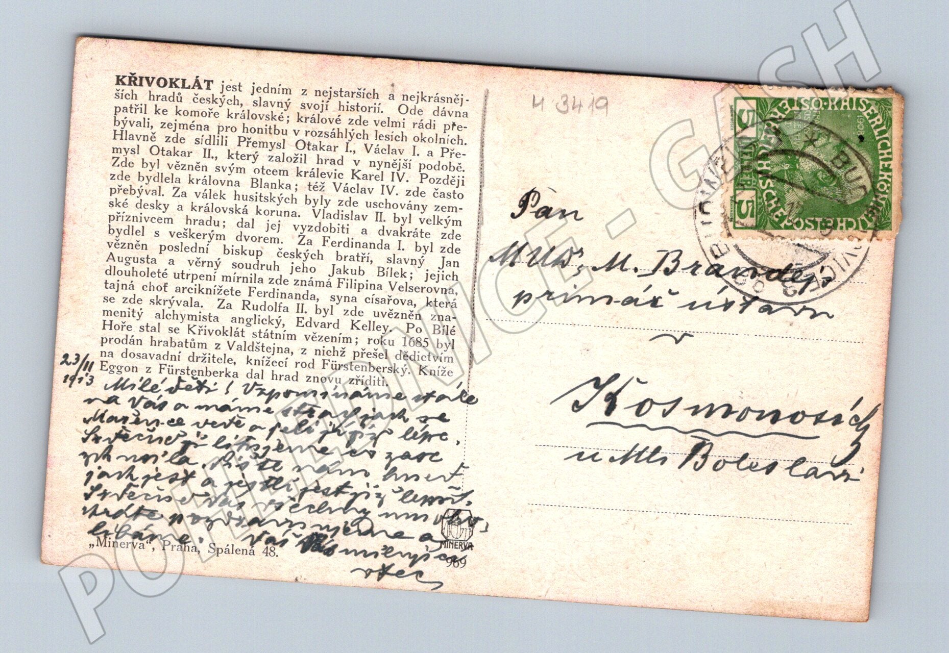 Originální historická pohlednice s vyobrazením hradu Křivoklát. Na přední straně je barevné kreslené ztvárnění známého českého hradu situovaného v malebné krajině s vesničkou a říčkou v popředí. Zadní strana obsahuje tištěný text s informacemi o historii hradu Křivoklát, adresní část a rukopisné věnování. Pohlednice prošlá poštou, frankovaná starou rakouskou známkou v hodnotě 5 heller, s přehledně čitelným razítkem. Jedná se o krásný sběratelský kousek z edice Minerva, Praha, Spálená 48. Vhodné do sbírek historických pohlednic nebo jako stylová dekorace.