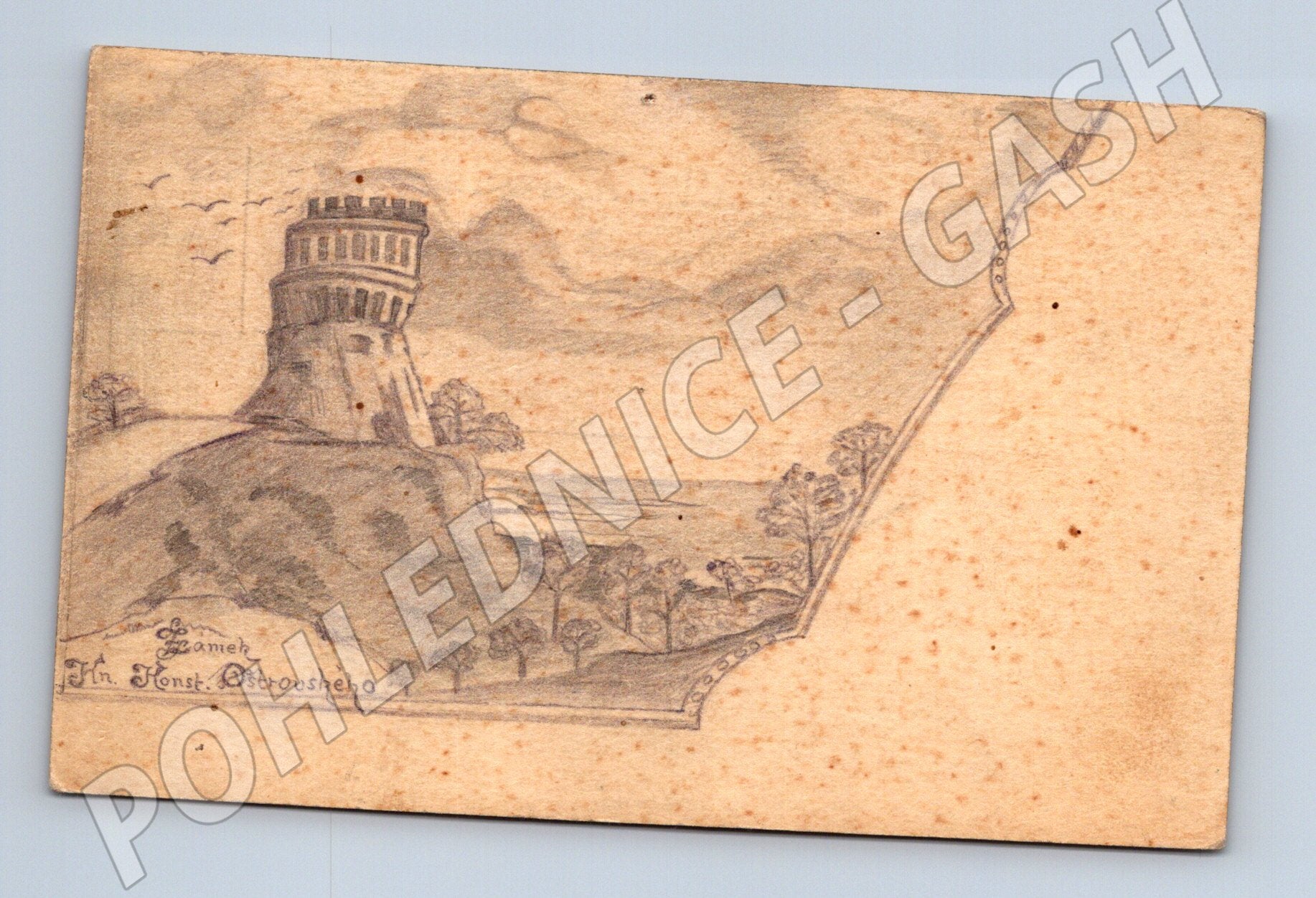 Originální stará pohlednice s kresbou hradu označeného jako Zámiek Jn. Konst. Ostrovského . Pohlednice je provedena v jemných sépiových tónech, patrně ručně kolorovaná či kreslená. Na přední straně je zachycen věžovitý objekt na útesu obklopený přírodou, v levém rohu nápis s názvem hradu. Zadní strana pohlednice je v ruštině - nápis Почтовая карточка , prostor pro známku s označením Město dla marki a popisné linky pro adresu. Pohlednice nese dobové stopy stáří, drobné flíčky a zažloutnutí papíru, které však pouze podtrhují její starobylý charakter. Skvělý sběratelský kus pro milovníky historických pohlednic s motivy hradů a zámků, či ruskojazyčných artefaktů.