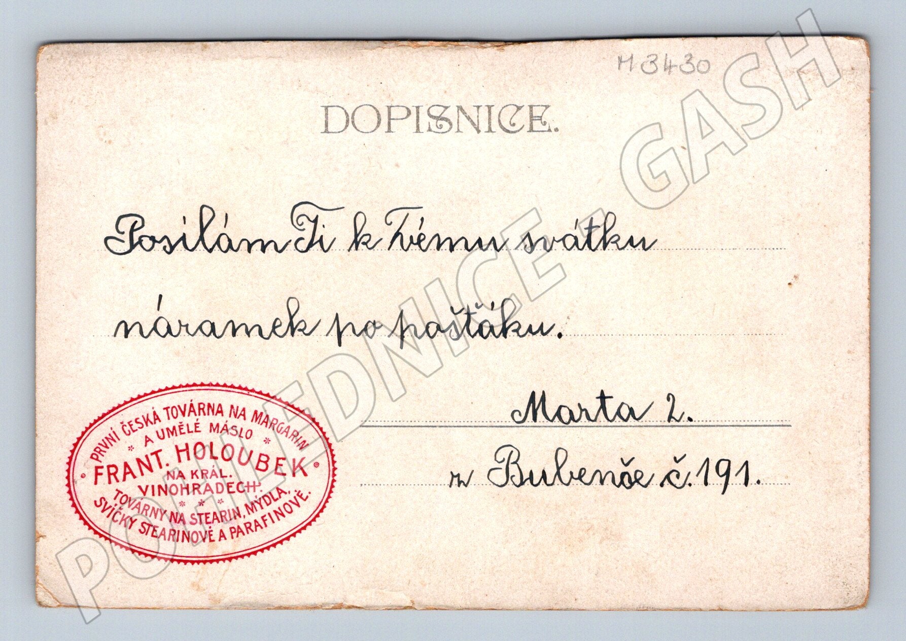 Originální stará pohlednice s motivem hradu Karlštejn (Karlsův Týn). Pohlednice je kolorovaná, krásně zachycuje pohled na hrad, obklopený malebnou krajinou a vesničkou v popředí. Na přední straně je ruční vzkaz. Zadní strana obsahuje ručně psaný text, razítko továrny Frant. Holoubek továrna na sterin. mýdla svíčky. margarýn a umělé máslo. Pohlednice nese známky stáří, okraje jsou jemně opotřebované, místy drobné flíčky, celkově však velmi hezký sběratelský stav. Vhodné pro milovníky historie, sběratele pohlednic i obdivovatele českých památek.