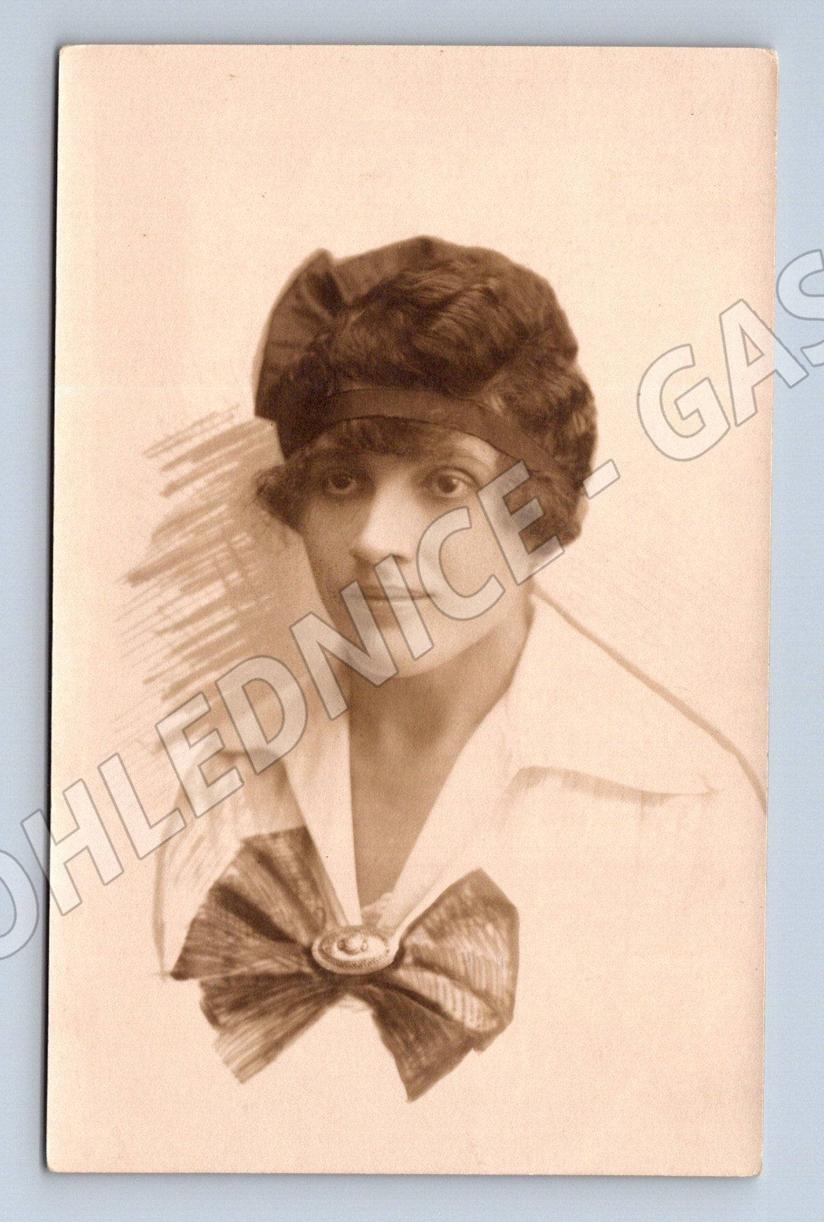 Nabízím starou pohlednici s portrétem mladé ženy, pravděpodobně z počátku 20. století. Pohlednice je provedena v sepiových tónech a zachycuje ženu s bohatě vlněnými vlasy, elegantním kloboukem a výraznou stuhou s ozdobou. Zadní strana pohlednice je nevyplněná, pouze s číslem tužkou. Stav odpovídá stáří - mírně opotřebované rohy a drobné zašpinění. Krásný sběratelský kousek pro milovníky starých portrétních pohlednic.
