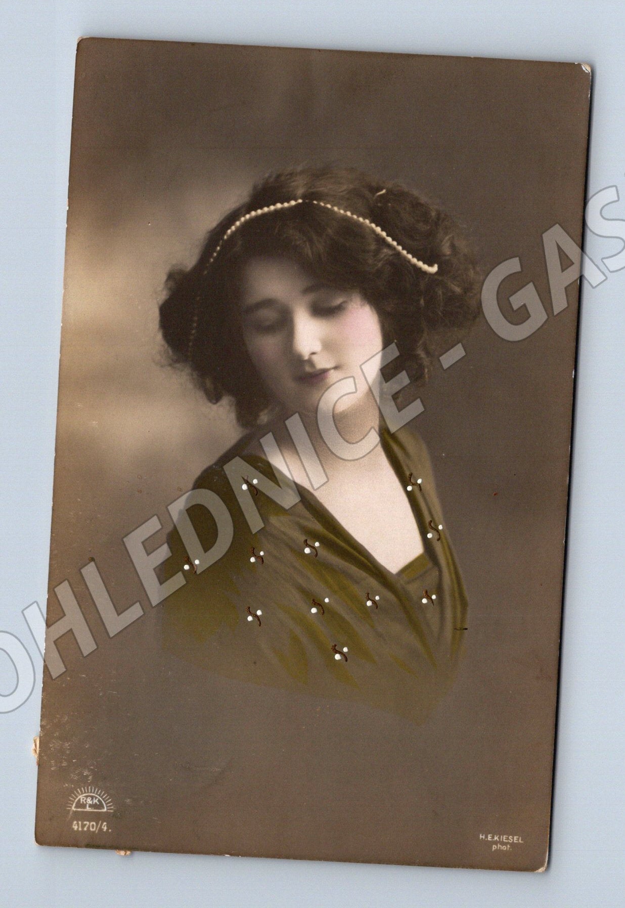 Originální stará pohlednice s portrétem ženy. Pohlednice je kolorovaná, s decentními perličkami na šatech a vlnitých tmavých vlasech. V levém dolním rohu je označení H. Engel, Praha. Z druhé strany je pohlednice nadepsána, s razítkem a rakouskou známkou v hodnotě 5 haléřů, adresovaná do Vídně. Krásný sběratelský kousek, vhodný do sbírky historických pohlednic a portrétů. Stav dle fotografií, mírné stopy stáří a opotřebení po okrajích.