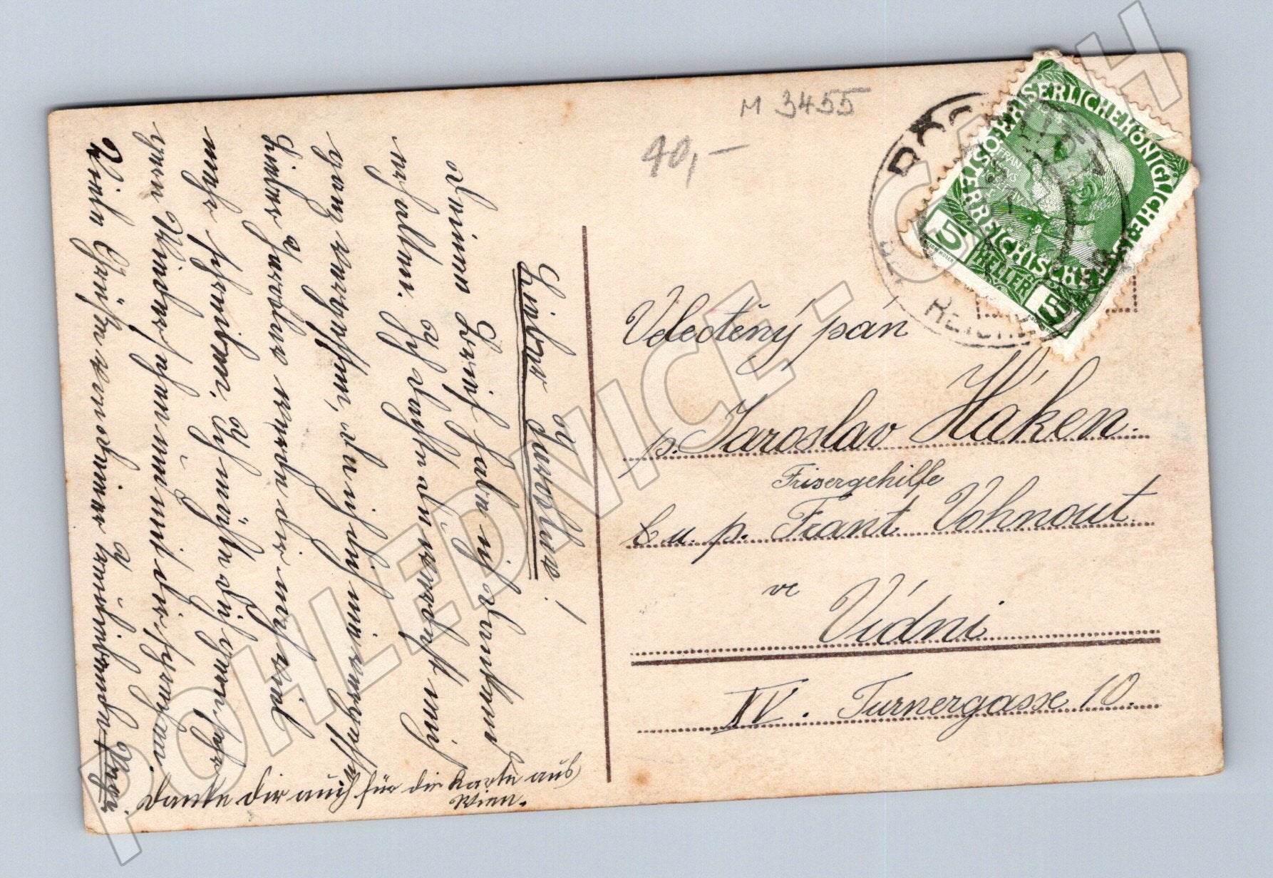 Stará portrétní pohlednice ženy – kolorovaná, adresovaná do Vídně