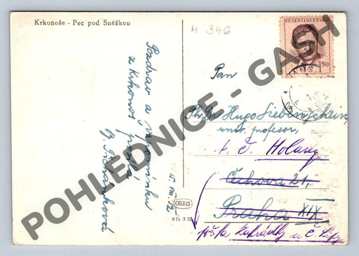Originální černobílá pohlednice s motivem Krkonoše – Pec pod Sněžkou. Na přední straně je krásný panoramatický pohled na horskou krajinu s typickými chalupami a cestou. Na zadní straně je ručně psaný text, adresát a poštovní známka z období Československa. Pohlednice je ve slušném sběratelském stavu, nepoškozená, odpovídající stáří. Skvělý doplněk do sbírky historických pohlednic nebo jako dárek pro milovníky hor a historie Krkonoš.