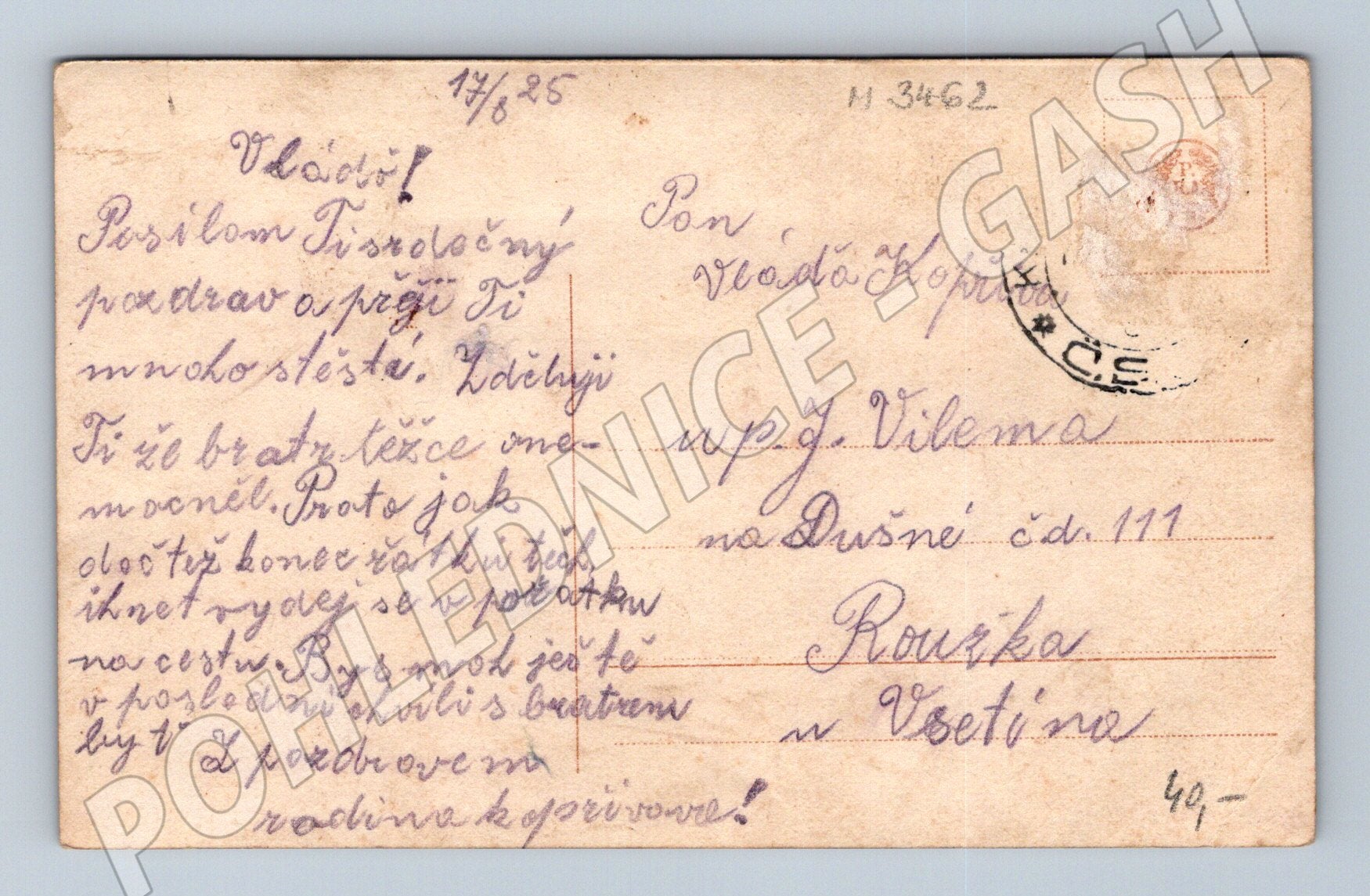 Starobylá pohlednice z roku 1925 s portrétem dámy a květinami. Pohlednice je ručně kolorovaná, s básnickým německým textem Boten der Liebe! a adresovaná rodině Kopřivové do Prahy. Na zadní straně je rukou psaný osobní vzkaz v češtině a odesílací razítko. Pohlednice nese známky stáří – zažloutnutí, lehké ohyby v rozích a drobné skvrny, přesto je krásným dokladem meziválečné korespondence a estetickým předmětem pro sběratele historických pohlednic.