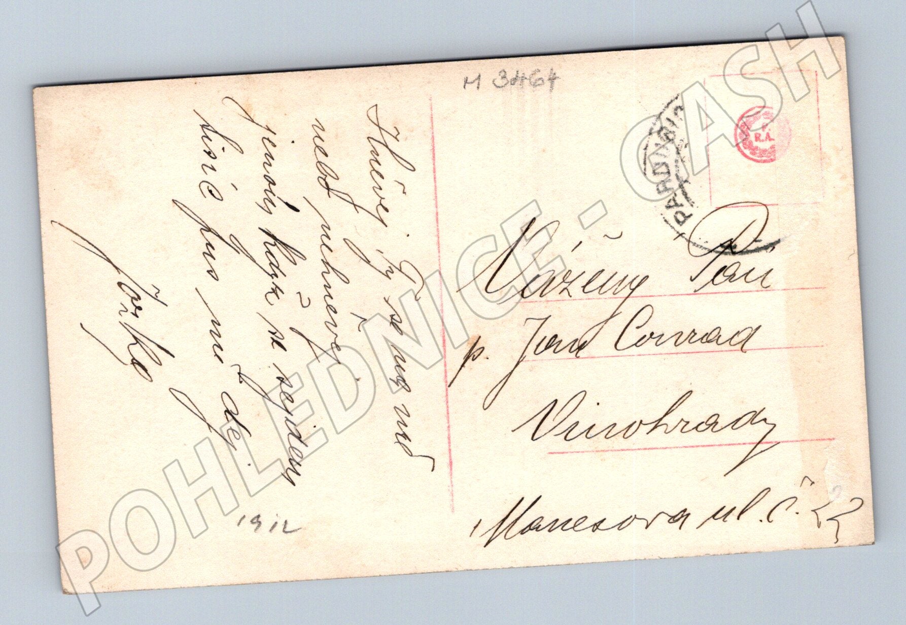 Originální stará pohlednice z roku 1912. Na přední straně je kolorovaná fotografie elegantní mladé ženy v dobových šatech s květinou a dopisem v ruce. Pohlednice je opatřená ručně psaným textem, adresovaná na Vinohrady (dnes součást Prahy), s poštovním razítkem Pardubice. Celkový stav pohlednice odpovídá stáří, místy drobné opotřebení, rohy mírně ohnuté, viz sken. Skvělá sběratelská položka s krásným námětem z počátku 20. století.
