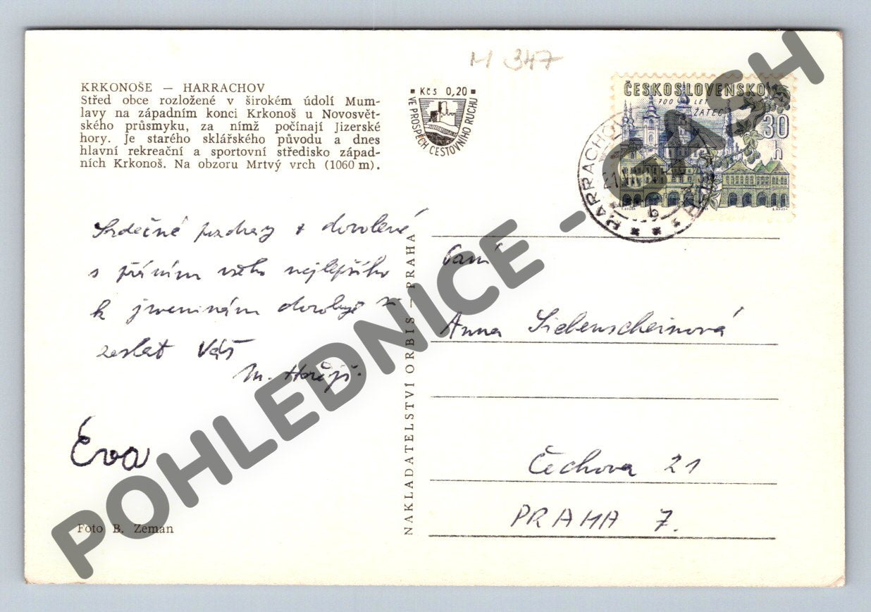 Originální dobová pohlednice s motivem města Harrachov v Krkonoších. Na přední straně pohlednice je černobílá fotografie s panoramatickým pohledem na Harrachov, obklopený lesy a horami, včetně Mrtvého vrchu (1060 m n. m.). Zadní strana obsahuje krátký popis v češtině, razítko, známku z období Československa a ručně psaný vzkaz s adresou. Pohlednice byla odeslána z Prahy a je unikátním dokladem historie a atmosféry této vyhledávané horské rekreační oblasti. Vydavatel: Orbis Praha, foto: B. Zeman. Velmi pěkný stav s dobovým poštovním razítkem a známkou.