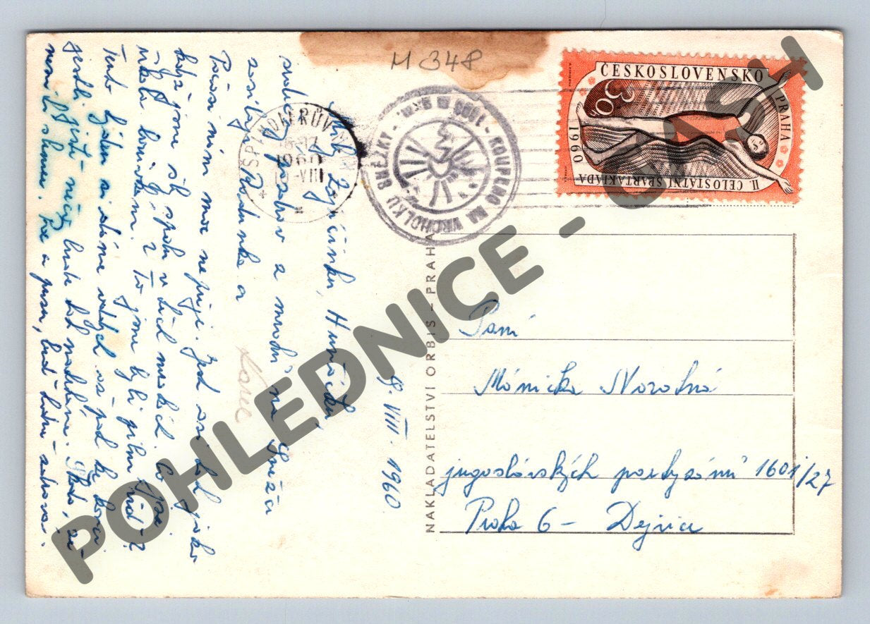 Originální černobílá pohlednice s názvem Krakonošův pozdrav ze Sněžky zachycuje postavu turistu s holí na horském svahu s výhledem na okolní krajinu Krkonoš a Sněžku. Pohlednice byla odeslaná v roce 1960, má ručně psaný text, známku a razítko. Stav: mírné opotřebení, skvrny zejména v horní části a vlevo dole. Ideální sběratelský kousek pro milovníky starých českých pohlednic a milovníky hor.