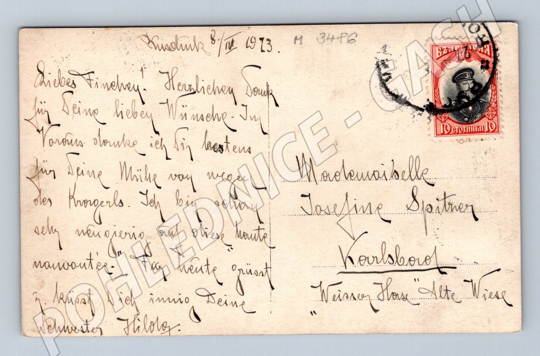 Starobylá pohlednice s uměleckým zobrazením svaté Máří Magdalény (Ste Madeleine). Pohlednice je tištěná v secesním stylu, vlevo je nápis Norden. Ste Madeleine. Магдалена a číslo 6004. Na zadní straně je ručně psané věnování v němčině, adresováno do Karlových Varů (Karlsbad), a zachovalá bulharská známka s portrétem a hodnotou 10 stotinek. Pohlednice je ve velmi dobrém stavu s patrnými stopami stáří po okrajích. Jedná se o cenný sběratelský kus vhodný pro milovníky starožitných a uměleckých pohlednic, sběratele historických poštovních zásilek i tematických pohlednic s motivem malířství.