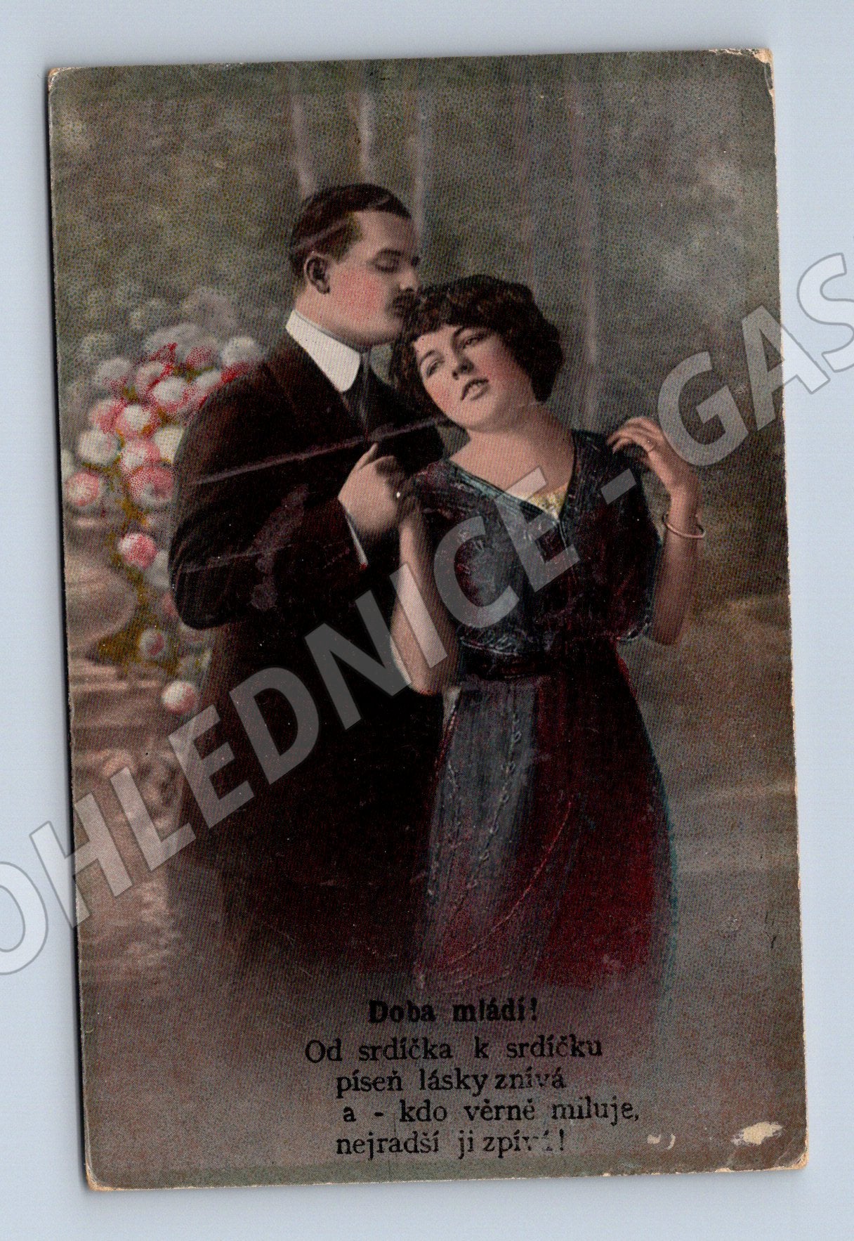 Originální stará pohlednice z období před rokem 1950, s motivem zamilovaného páru v interiéru. Na přední straně je český text: Doba mládí! Od srdíčka k srdíčku píseň lásky znívá a kdo věrně miluje, nejradši ji zpívá! Pohlednice je kolorovaná, v dobrém sběratelském stavu, s drobným opotřebením na okrajích (viz foto). Na zadní straně je poštovní prošlé razítko, známka a ručně psaný vzkaz adresovaný slečně. Skvělý sběratelský kousek dokreslující dobu a styl komunikace první poloviny 20. století. Rozměr typu malý formát. Vhodné pro sběratele historických pohlednic i milovníky nostalgie.