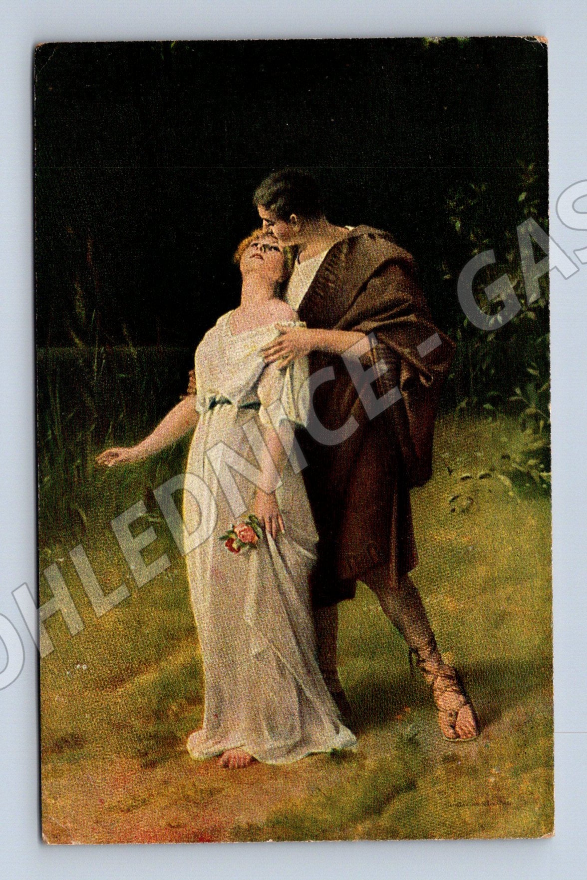 Starší umělecká pohlednice s názvem Der erste Kuß (První políbení) od G. Schrödtera. Pohlednice zobrazuje romantickou scénu v přírodě – mladý muž a mladá žena v historických oděvech se k sobě naklánějí v romantickém gestu. Pohlednice je neprošlá, na zadní straně jsou informace o autorovi a názvu díla v několika jazycích. Celkový stav viz foto – lehce opotřebené rohy, barvy zachovalé. Rozměry jsou standardní pro malý formát pohlednic této doby. Skvělý sběratelský kousek pro milovníky umění a romantiky.