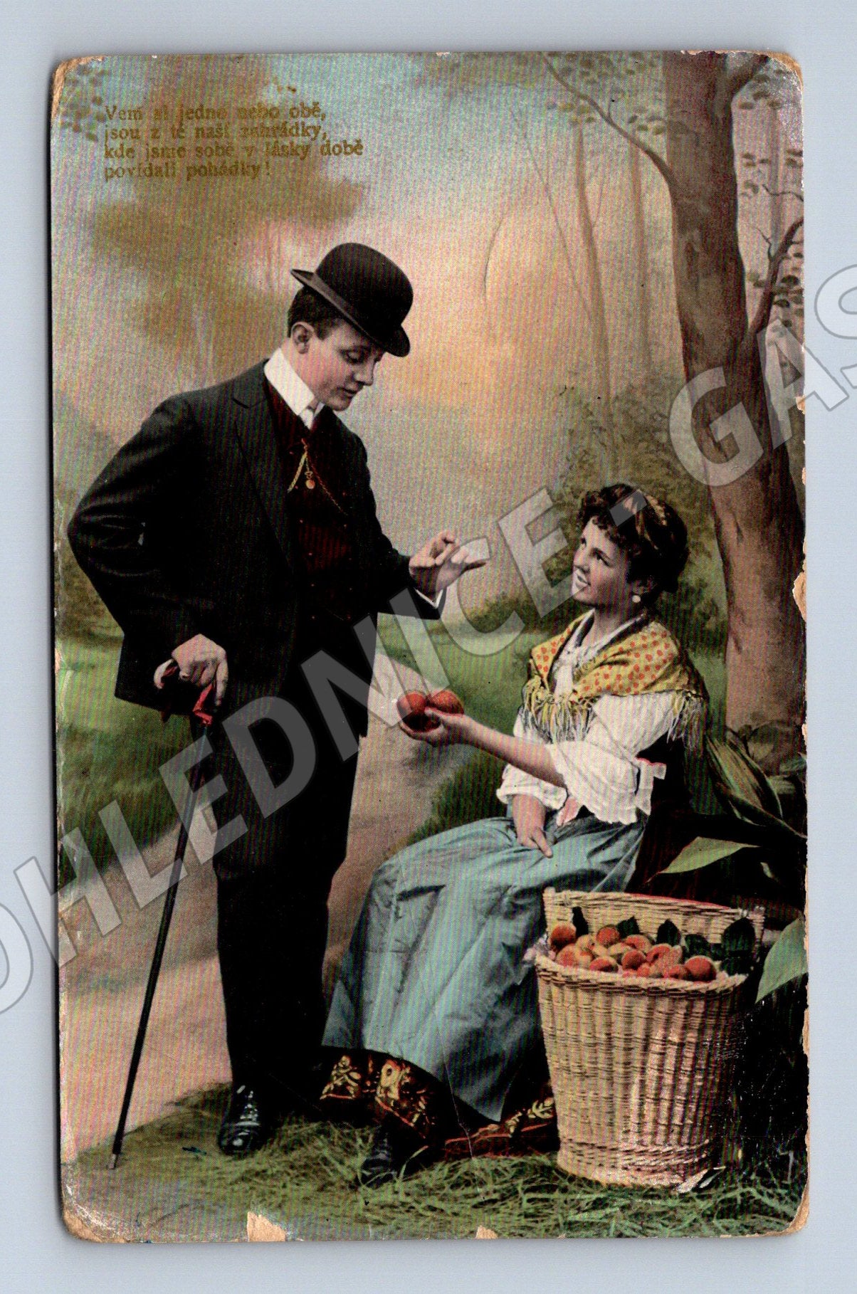 Originální stará pohlednice s etnografickým motivem – scéna muže a ženy v tradičním dobovém oblečení pod stromem, žena drží košík plný ovoce. Barevná pohlednice, na přední straně poetický text. Zadní strana obsahuje ručně psaný vzkaz, adresu a poštovní známku s razítkem z roku 1912. Pohlednice je součástí tzv. etnografických motivů, které zachycují venkovský život a lidové tradice. Sběratelsky zajímavý kousek, drobné opotřebení okrajů, celkově velmi zachovalý stav.