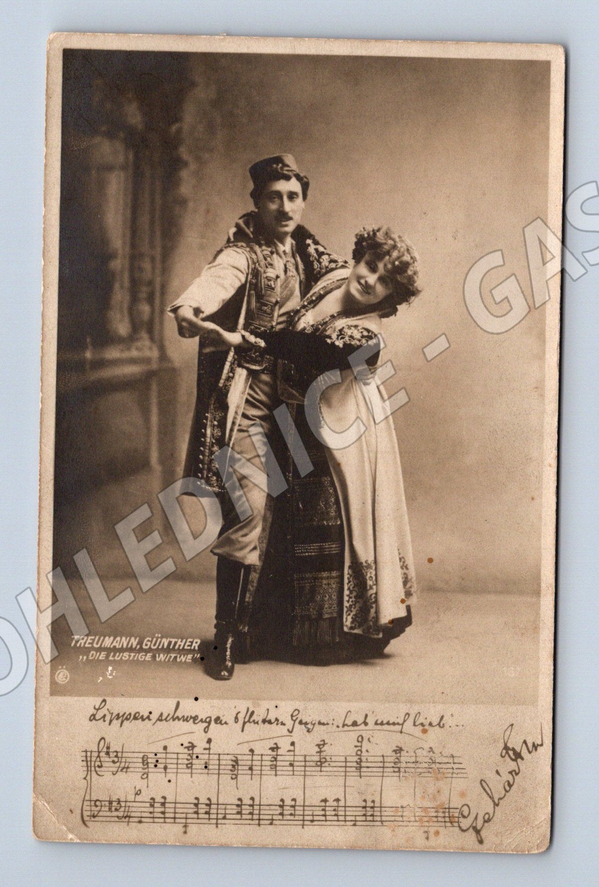 Originální stará pohlednice s motivem divadelní dvojice Treumann-Günther z vídeňského divadla. Na přední straně najdeme uměleckou černobílou fotografii dvou herců v elegantních dobových kostýmech. V levé části pohlednice je notový zápis a několik řádků textu. Vydání pochází z Vídně (Verlag des k. k. priv. Theaters a. d. Wien), č. 187. Rubová strana obsahuje označení „Postkarte“ a více jazykové názvy. Pohlednice nese známky stáří a lehkého opotřebení, vhodné do sbírky milovníků starých divadelních pohlednic nebo historických osobností.