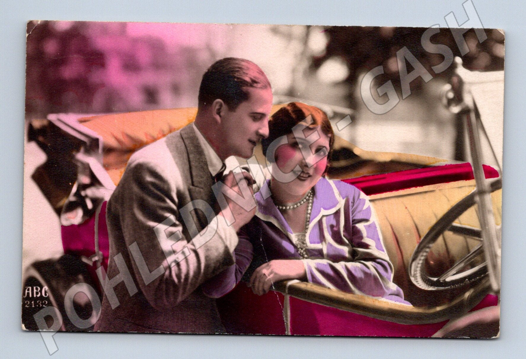 Nabízím originální starou pohlednici z období 20. nebo 30. let 20. století. Pohlednice je kolorovaná, na přední straně zachycuje elegantní pár u otevřeného historického automobilu. Obraz nese známky dobového stylu, typického pro meziválečné období, a působí velmi romantickým dojmem. Na zadní straně je uvedeno Made in France – Fabriqué en France , pohlednice nebyla použitá (nezaslaná, čistá). Stav viz sken – rohy lehce otřené, mírné známky stáří a skladování. Krásný sběratelský kousek pro milovníky starých automobilů i dobové atmosféry.