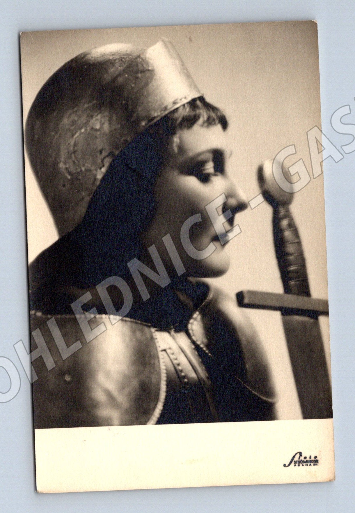 Tato zajímavá černobílá pohlednice zachycuje detail plastiky nebo sochařského díla, která zobrazuje ženskou tvář s helmou a kopím. Pohlednice působí umělecky a je vyvedena v originálním stylu. Na zadní straně je razítko Koupěno: u Jana Vernera, Praha XII a značka Kodak, což svědčí o kvalitním fotografickém provedení. Vhodná pro sběratele historických či uměleckých pohlednic. Stav je velmi dobrý, bez popisu, čistá.