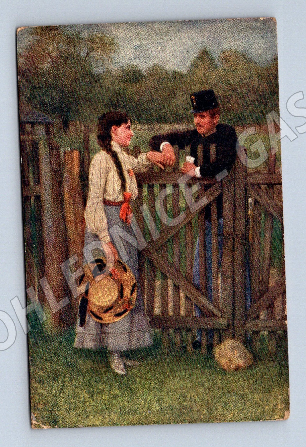 Starší pohlednice s názvem Kadetova láska od malíře Františka Ženíška. Pohlednice zachycuje romantickou scénu u vesnické branky, kde mladý kadet přes plot předává květinu dívce. Pohlednice je neprošlá poštou, stav odpovídá stáří – mírně opotřebované rohy, drobné skvrny a lehké zašpinění rubu. Text na zadní straně ve čtyřech jazycích. Vhodné pro sběratele historických uměleckých pohlednic.