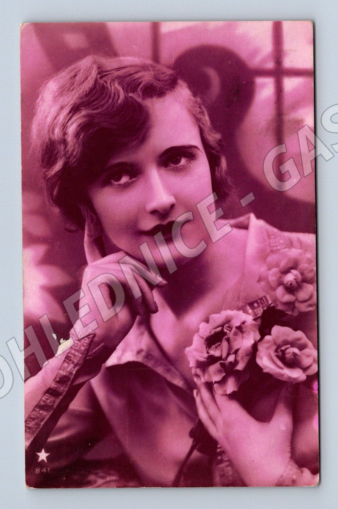 Historická pohlednice herečka 1928, kolorovaná, známka ČSR