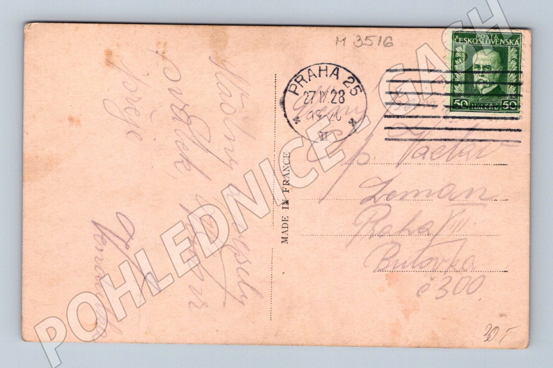 Nabízím originální historickou pohlednici s portrétem herečky z přelomu 20. a 30. let 20. století. Pohlednice je kolorovaná do fialových tónů, s dekorativním květinovým motivem v popředí. Na zadní straně je rukopisný text, adresa a známka 50 haléřů s razítkem Praha 25, datovaným 27. XI. 1928. Pohlednice byla vyrobena ve Francii (MADE IN FRANCE) a je ve velmi dobrém sběratelském stavu, s drobnými známkami stáří. Vhodné pro sběratele starých pohlednic, divadelní historie nebo filatelisty, kteří ocení původní známku i razítko.