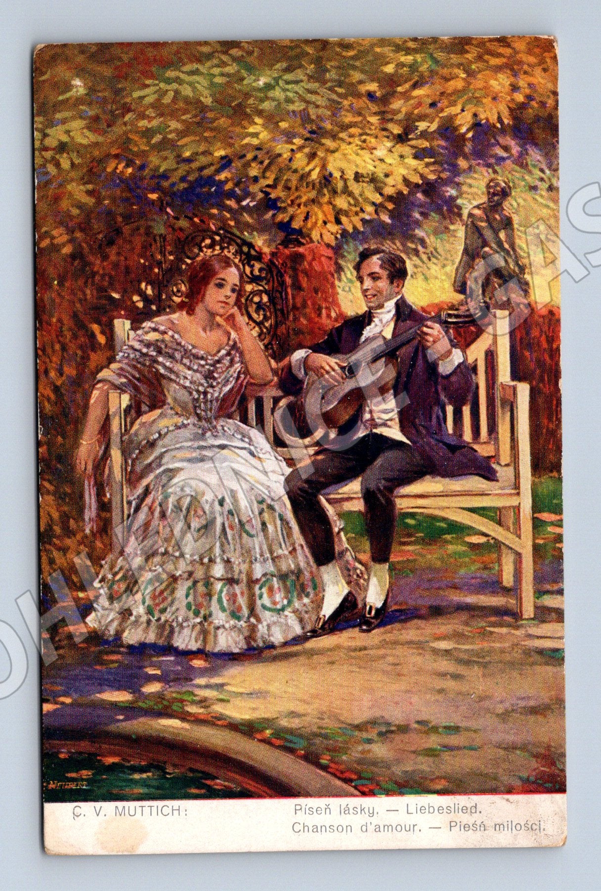 Umělecká pohlednice Č. V. Muttich – Píseň lásky, romantická scéna