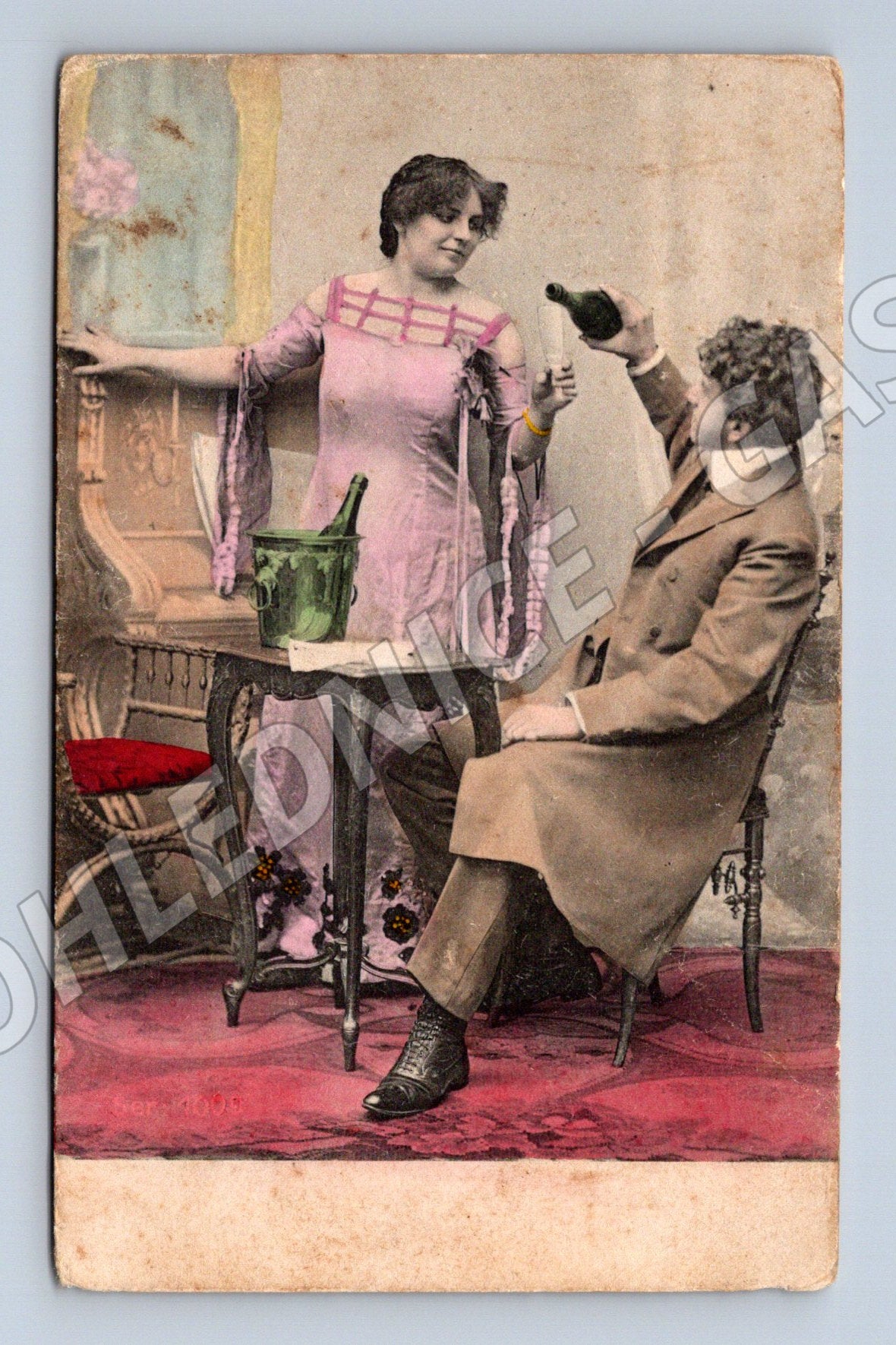 Starobylá pohlednice z období Rakouska-Uherska, malý formát, ručně kolorovaná, datovaná před rokem 1950. Na lícové straně je zajímavá scénka dvou osob v interiéru – žena v růžových večerních šatech sedící na židli a muž v saku nad ní natahující ruku s lahví. Scéna je zachycena v jemných pastelových barvách s ruční kolorací a působí humorně a netradičně. Reverz s původním poštovním razítkem, známkou a ručně psaným textem adresovaným na slečnu Andulku Šťastnou do Svárova. Pohlednice nese typické znaky dobové korespondence a je vhodná pro sběratele historických pohlednic a milovníky staré ČR epistolární historie. Stav odpovídá stáří – mírné opotřebení, místy zašpinění a otěry.