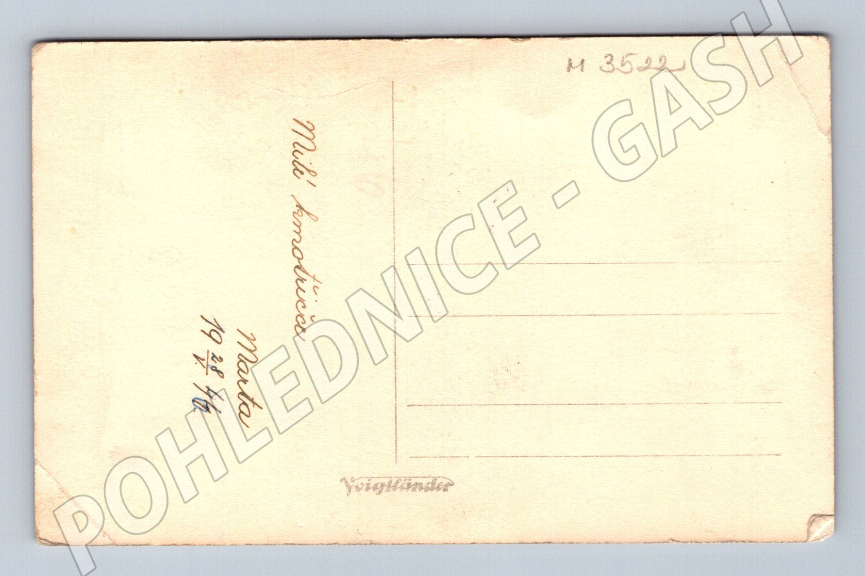 Originální stará černobílá pohlednice z období před rokem 1950, na které je zachycena dívka v bílých šatech s květinovým věncem a květinou v ruce spolu se starší ženou ve společenském oděvu. Pohlednice má ručně psaný vzkaz s datem 19. září 1941 a podpisem Marta. Na rubu je originální nápis Voigtländer . Stav je odpovídající stáří, místy jsou patrné drobné ohyby a opotřebení rohů. Vhodné pro sběratele historických pohlednic, dokumentující rodinné a společenské události v meziválečném a válečném období na území tehdejšího Československa.