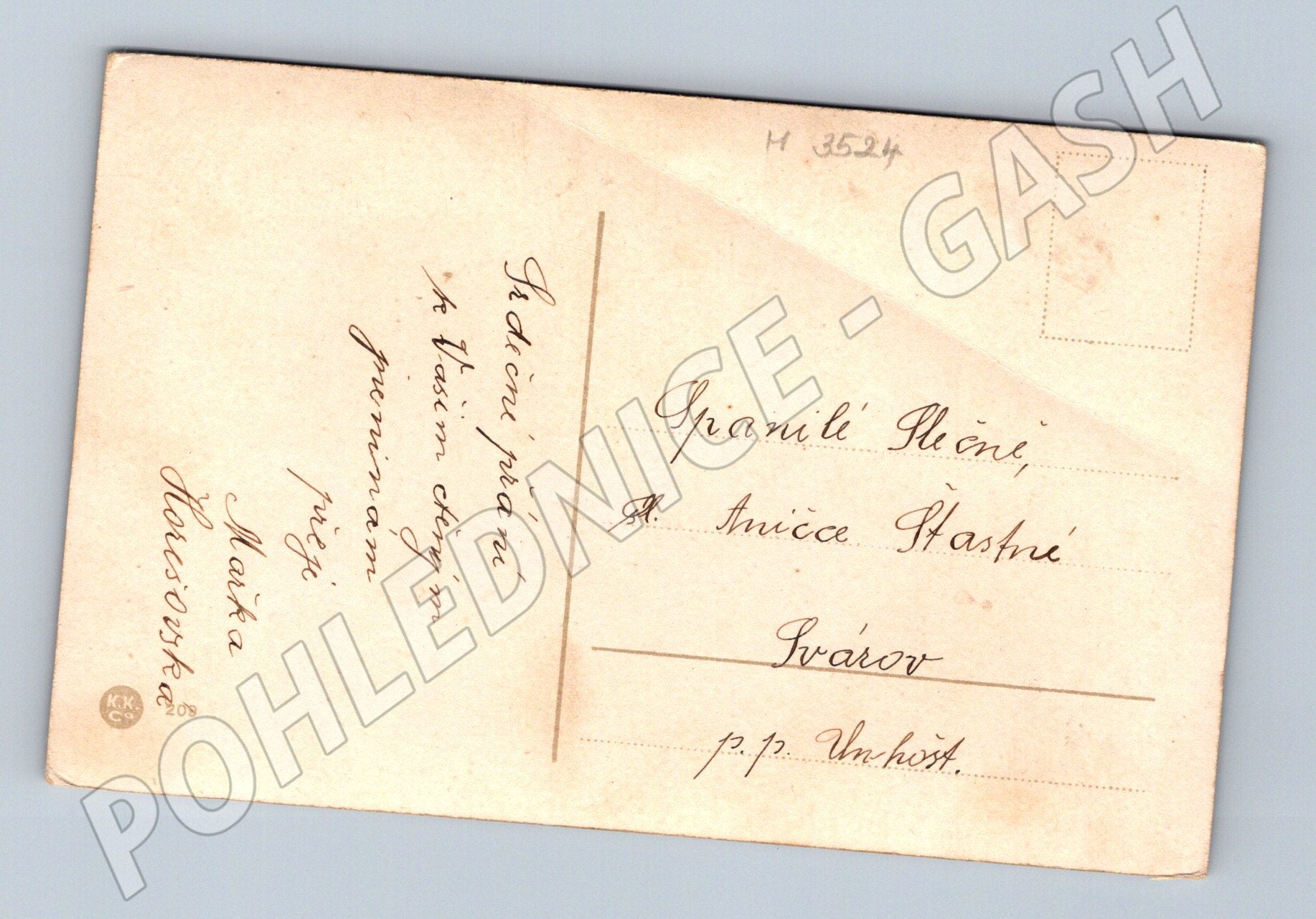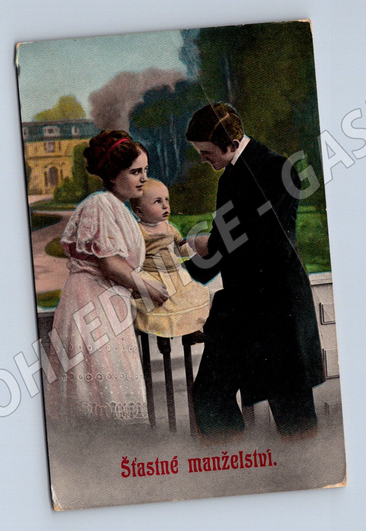Originální stará pohlednice s názvem Šťastné manželství . Pohlednice je kolorovaná, vyobrazena je scéna mladého páru s dítětem v elegantním oblečení, v romantickém zahradním prostředí s historickou budovou v pozadí. Na přední straně je nápis Šťastné manželství . Zadní strana je popsána ručně inkoustem s věnováním, včetně adresy adresáta. Jedná se o malý formát, pohlednice pochází z období před rokem 1950. Hezký sběratelský stav, vhodné pro milovníky starých pohlednic a romantických motivů.