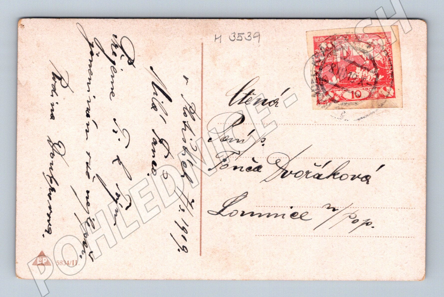 Originální stará pohlednice z roku 1919 s kolorovaným motivem dvou dětí, z nichž jedna drží květiny. Pohlednice je zaslaná, se známkou a rukopisným textem na zadní straně. Přítomná známka z období Československa. Rozměr pohlednice malého formátu (před rokem 1950). Jedná se o zajímavý sběratelský kus s motivem dětí, vhodný jako dárek nebo rozšíření sbírky historických pohlednic. Stav viz foto, lehce opotřebené rohy, celkově velmi zachovalé.