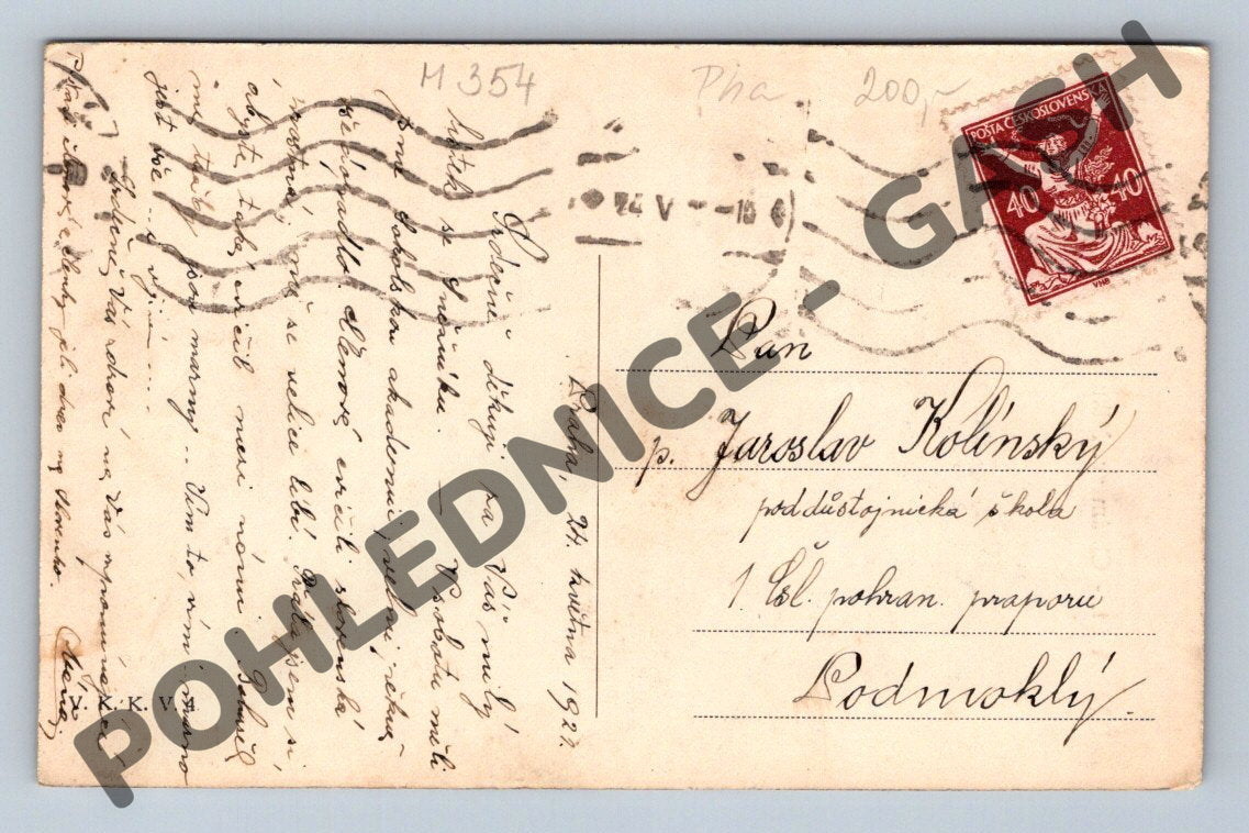 Originální stará pohlednice s pohledem na PRAHU III. – Chrám sv. Mikuláše a Hradčany. Jedná se o malý formát pohlednice (typický pro období do roku 1950). Pohlednice je černobílá, s detailním vyobrazením střech a historické architektury Prahy. Na zadní straně je ručně psaný text z roku 1921 a použita dobová čs. známka s razítkem. Pohlednice byla zaslána adresátovi Jaroslavu Kolínskému do Podmokel. Stav viz foto – mírně opotřebené rohy, drobné známky stáří.
