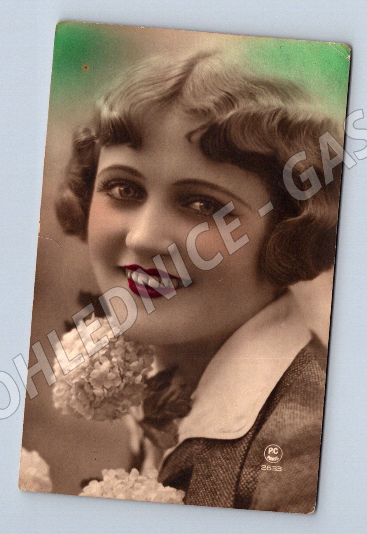 Nabízím originální starou pohlednici s portrétem herečky, datace cca 20.–30. léta 20. století. Pohlednice je kolorovaná, s výraznou barevnou retuší rtů a očí. Na přední straně je portrét mladé ženy s květinami, typický glamour styl z meziválečného období. Zadní strana je nepopsaná, se znaky stáří a drobnými skvrnami, označení Made in France . Formát přibližně 9 x 14 cm. Velmi pěkný sběratelský stav, pravý retro skvost pro milovníky filmové historie a pohlednic.