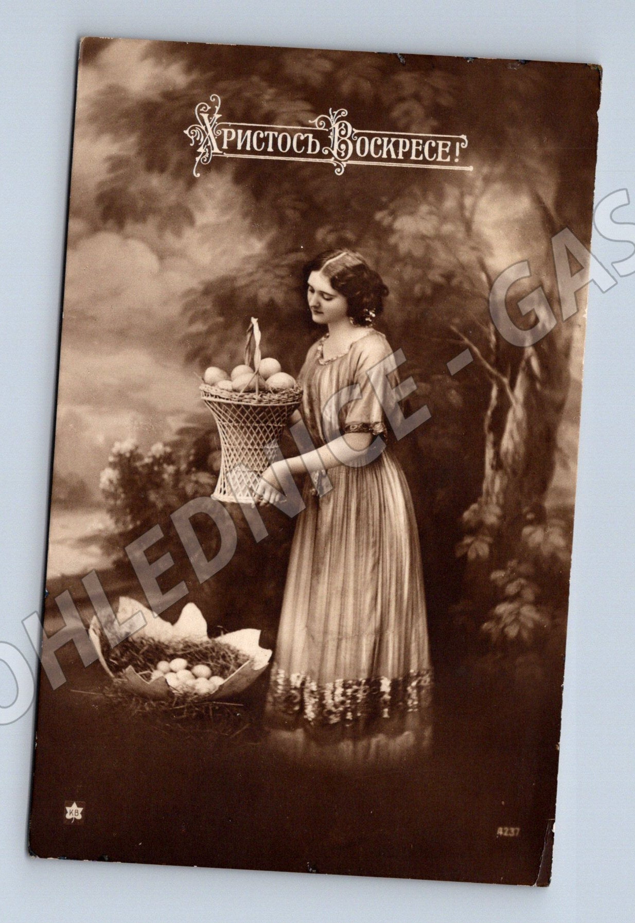 Starobylá velikonoční pohlednice s ruským nápisem Христос Воскресе! (Kristus vstal z mrtvých!). Pohlednice zachycuje dívku v tradičních šatech s košíkem vajíček, což je typický motiv spojený s velikonočními svátky v Rusku. Barevně laděná do sepiově hnědých tónů, s krásným uměleckým provedením. Na zadní straně je ručně psaný vzkaz a poštovní razítko; pohlednice prošla poštou. Výborný sběratelský stav s mírnými známkami stáří na rozích. Vhodné pro sběratele ruských pohlednic, etnografických motivů či tematických velikonočních karet.