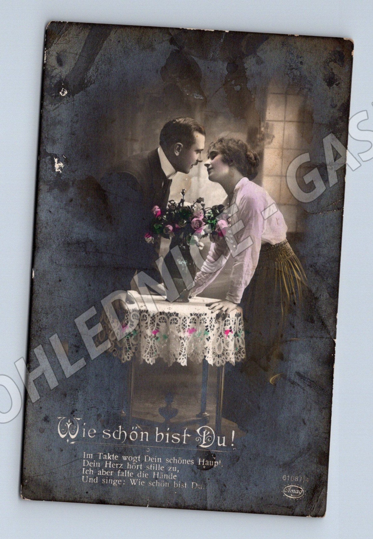 Starobylá pohlednice malého formátu s ručně kolorovaným motivem mileneckého páru s květinami, s německým nápisem Wie schön bist Du . Na zadní straně naleznete rukopisný text v češtině, odeslaný v době Rakouska-Uherska, s razítkem a známkou. Pohlednice nese známky stáří a opotřebení (viz foto), což dokresluje její historickou atmosféru. Skvělý sběratelský kousek pro milovníky starých pohlednic či historických dokumentů.
