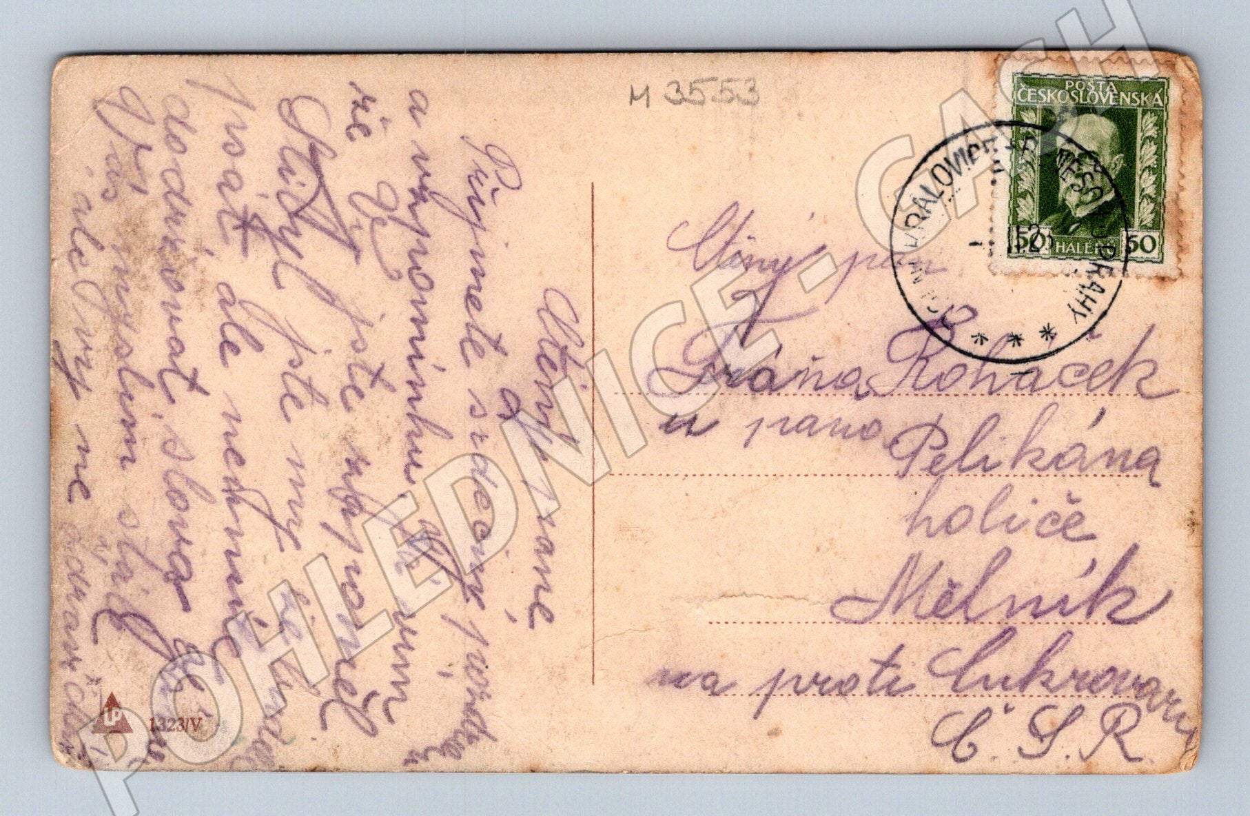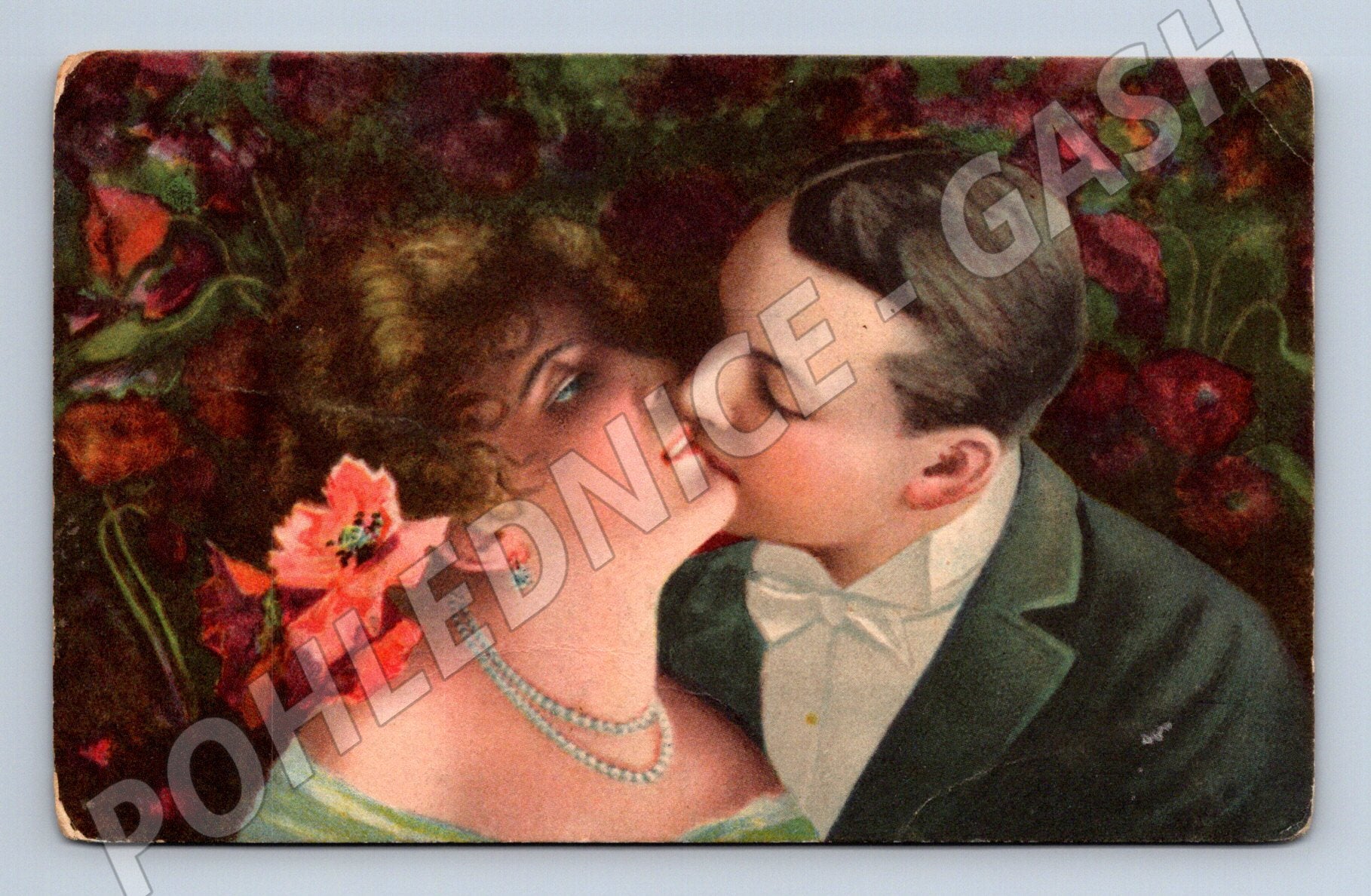 Nabízím originální starou českou pohlednici malého formátu z období první poloviny 20. století, odeslanou v ČSR. Pohlednice zobrazuje romantickou scénu – ilustraci zamilovaného páru při polibku, dekorovanou květinovým motivem v pozadí. Pohlednice byla skutečně odeslána, nese původní poštovní známku (50 haléřů, Pošta Československá) a jasné razítko. Zadní strana obsahuje ručně psaný text a adresu (určeno pro Františka Koháčka do Mělníka). Ideální pro sběratele historických pohlednic, uměleckých ilustrací a dobové korespondence. Stav viz foto, mírné opotřebení odpovídající stáří, rohy mírně ohnuté. Velice zajímavý sběratelský artefakt a sentimentální pohled do minulosti.