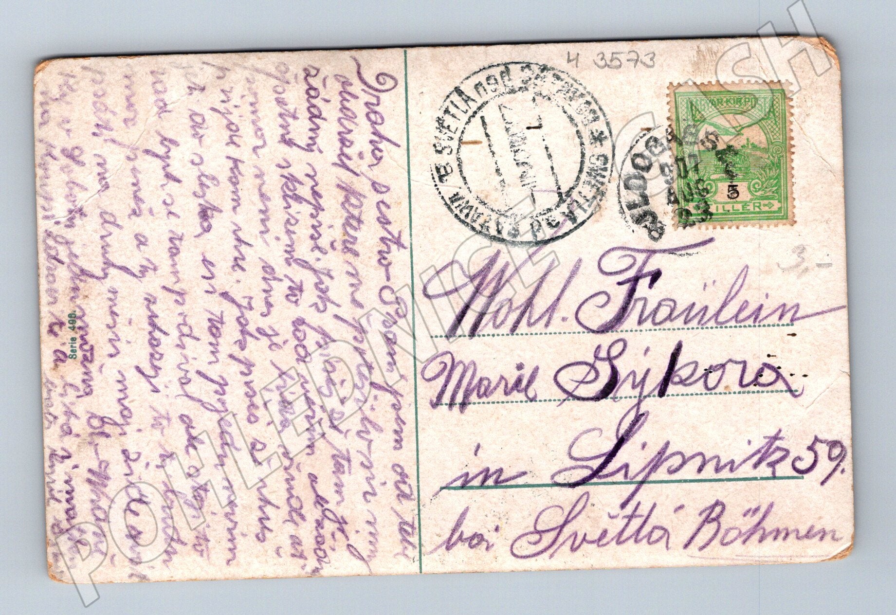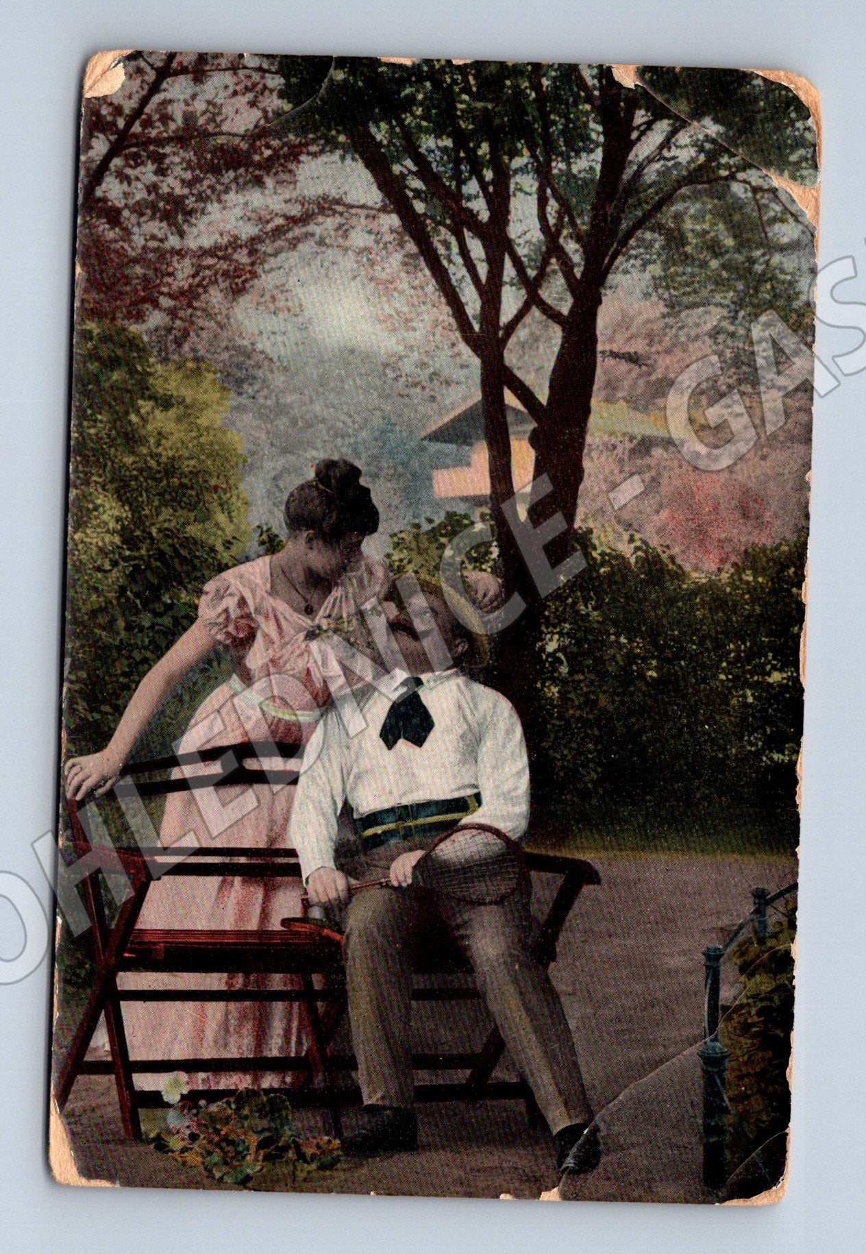 Originální stará pohlednice z Maďarska s ručně kolorovaným motivem dívky a chlapce na lavičce v parku. Pohlednice je datována a opatřena maďarskou známkou (5 fillér), poštovní razítko je čitelné. Text je napsán ručně fialovým inkoustem. Pohlednice má mírně opotřebované a ohlé rohy, jinak je ve slušném sběratelském stavu. Skvělý historický artefakt pro sběratele pohlednic či zájemce o historii centrální Evropy. Formát klasický, cca 9 x 14 cm.