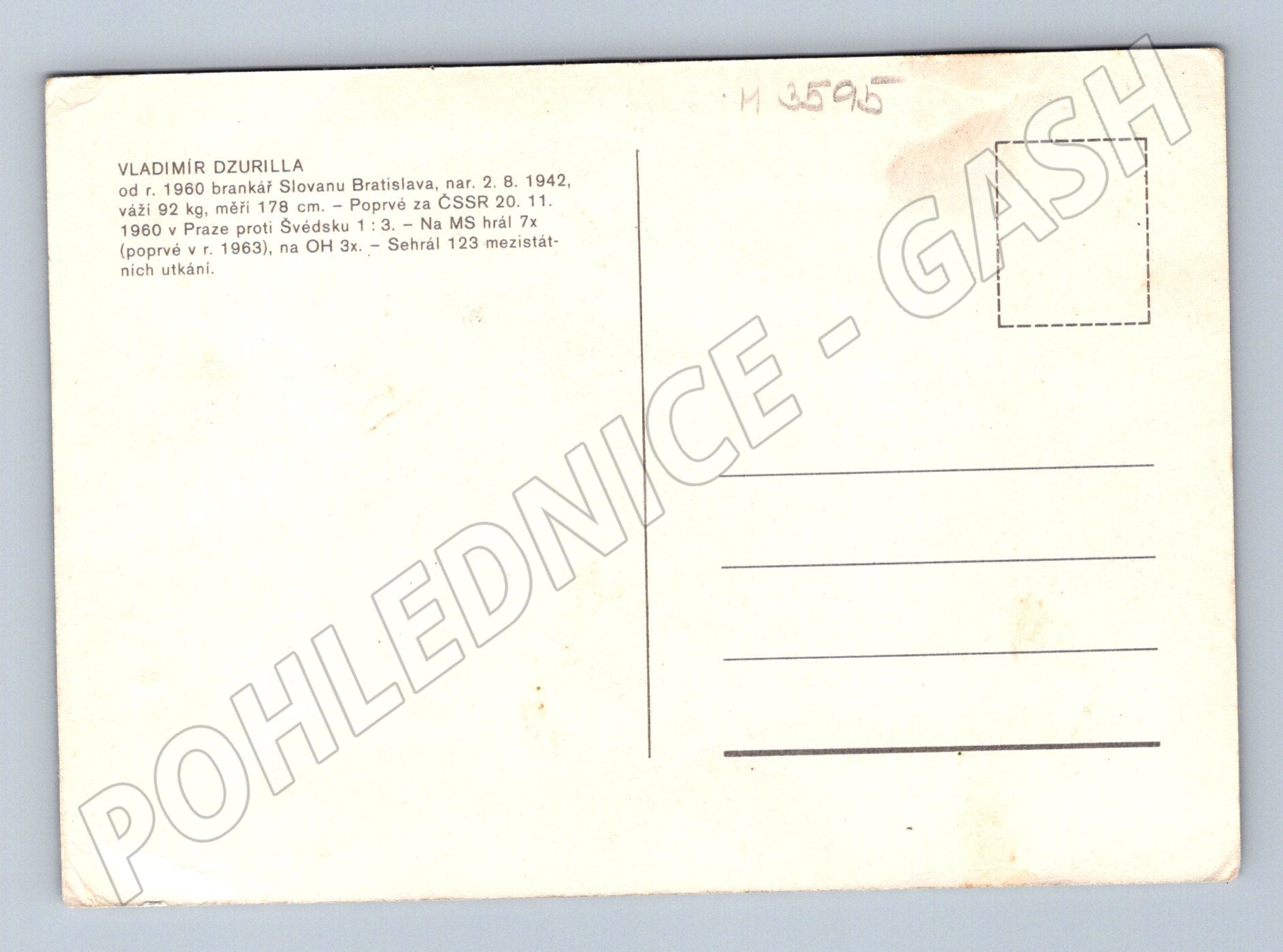 Nabízím originální sběratelskou pohlednici s vyobrazením Vladimíra Dzurilly, legendárního brankáře československé hokejové reprezentace a Slovanu Bratislava. Pohlednice zachycuje hráče v brankářské výstroji a dresu s označením CSSR. Na zadní straně je stručný životopis, včetně údajů o jeho sportovní kariéře: počet startů za národní tým, účast na mistrovstvích světa i olympijských hrách. Pohlednice není popsána, je v pěkném stavu a vhodná do sbírky každého fanouška ledního hokeje nebo sběratele pohlednic se sportovní tematikou.