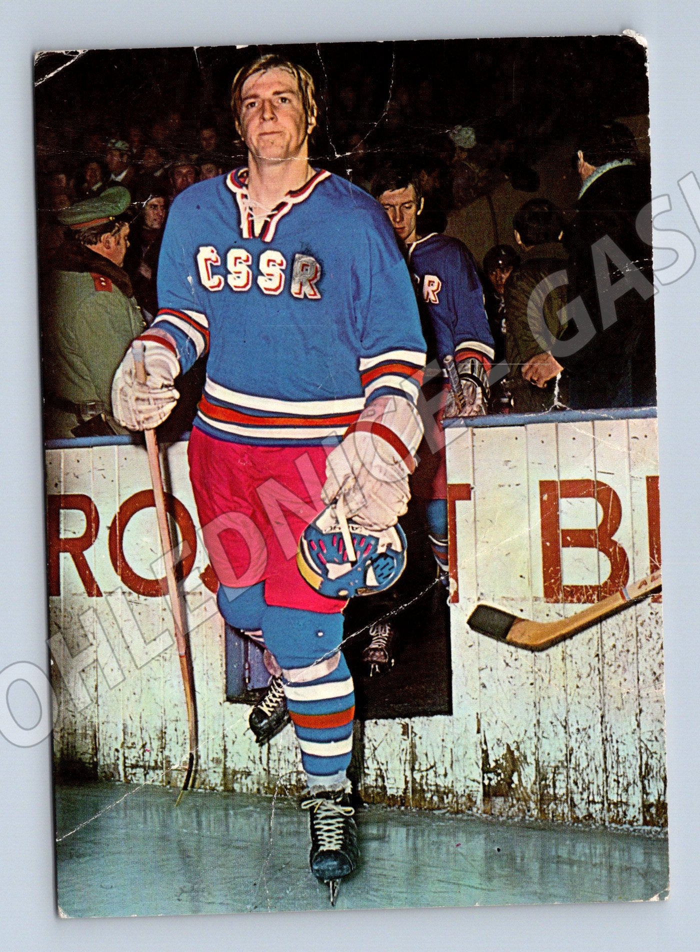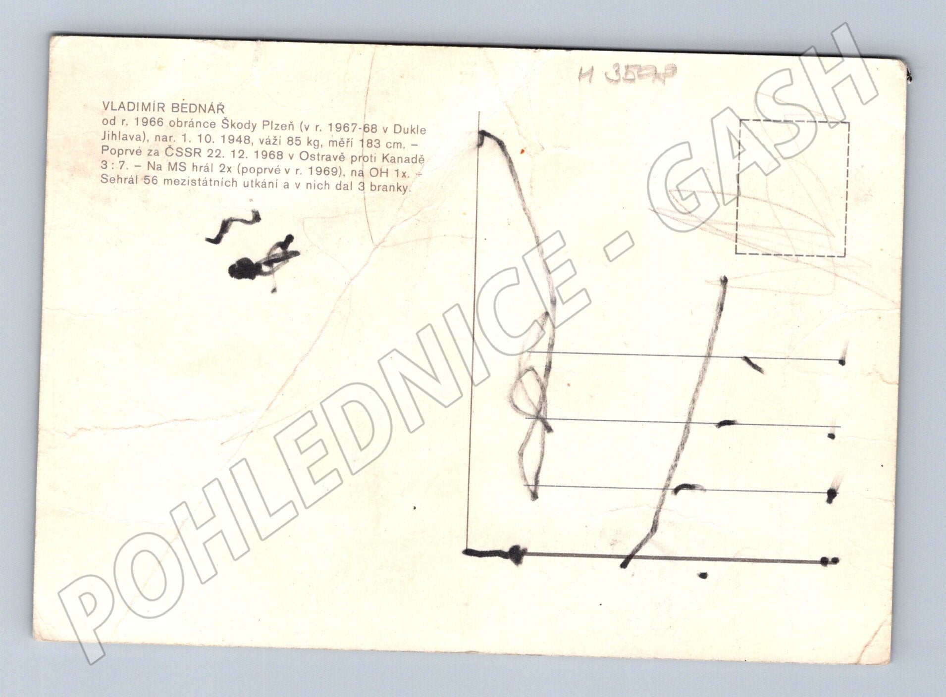 Originální dobová pohlednice s hokejistou Vladimírem Bědnářem, hráčem Škody Plzeň a Dukly Jihlava, reprezentantem ČSSR. Na přední straně je akční barevná fotografie hokejisty v dresu ČSSR během utkání, na pozadí je vidět část stadionu a rozhodčí. Zadní strana poskytuje biografické údaje: Vladimír Bědnář byl obránce, nastoupil poprvé za ČSSR v roce 1968 v Ostravě proti Kanadě, účastník MS a OH, sehrál 56 mezinárodních utkání a vstřelil 3 branky. Pohlednice nese známky stáří (ošoupané rohy, mírné ohnutí, razítko čitelné, dětské čmárance). Sbírkový kousek pro fanoušky historického hokeje a sběratele sportovních pohlednic.