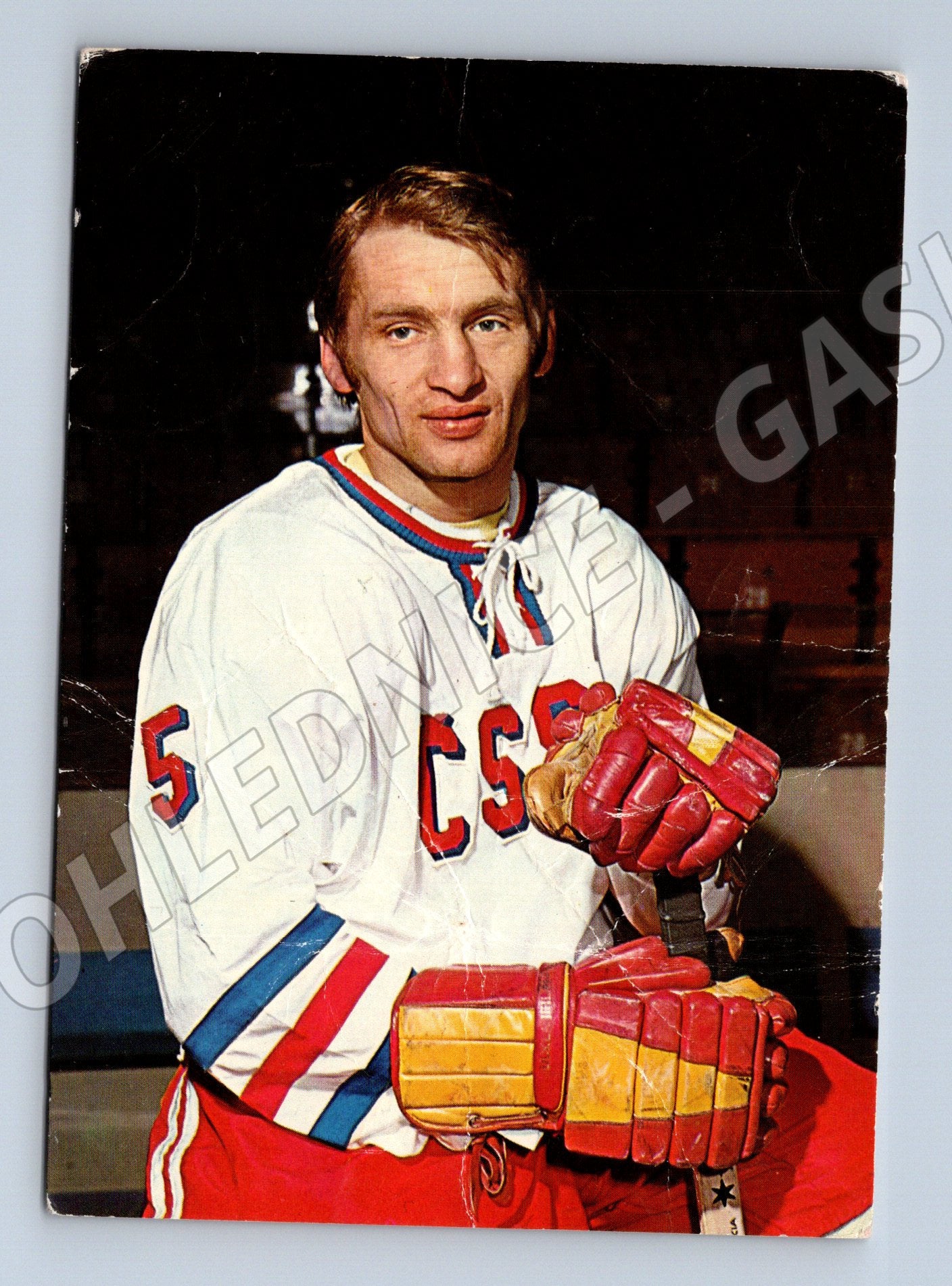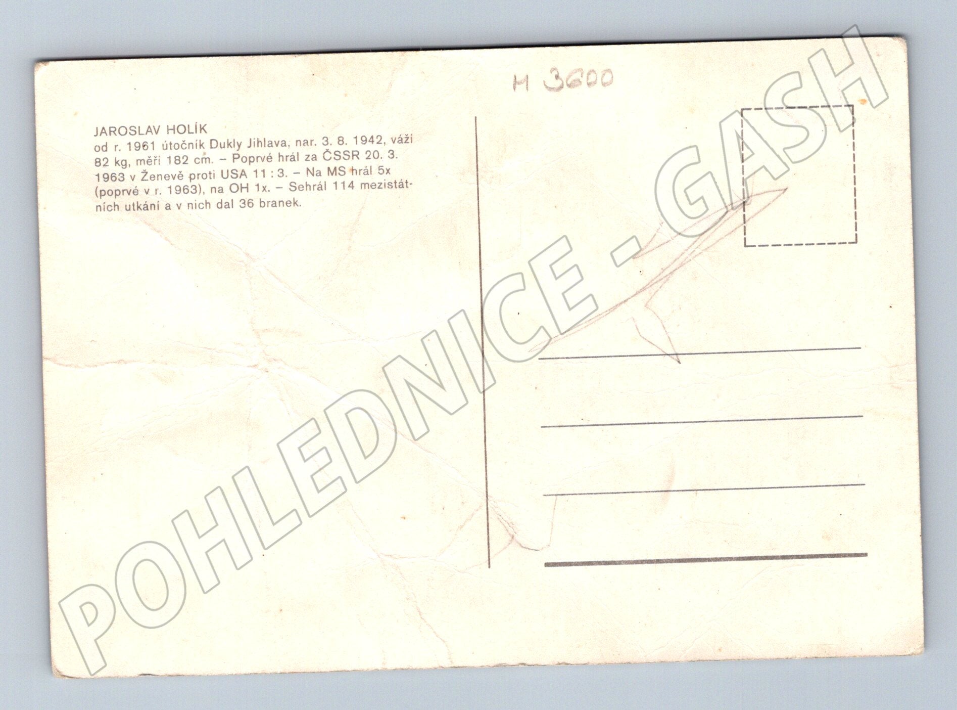 Originální pohlednice s portrétem slavného československého hokejisty Jaroslava Holíka v reprezentačním dresu s číslem 5. Pohlednice obsahuje stručný životopis a kariérní úspěchy Jaroslava Holíka, včetně jeho působení v Dukle Jihlava, debutu za ČSSR v roce 1963 a účasti na mistrovství světa a olympijských hrách. Na zadní straně pohlednice je místo pro známku a adresu, pohlednice nese běžné známky stáří a používání (ohyb, mírné opotřebení rohů). Skvělý sběratelský kousek pro fanoušky hokeje a sběratele sportovních pohlednic.