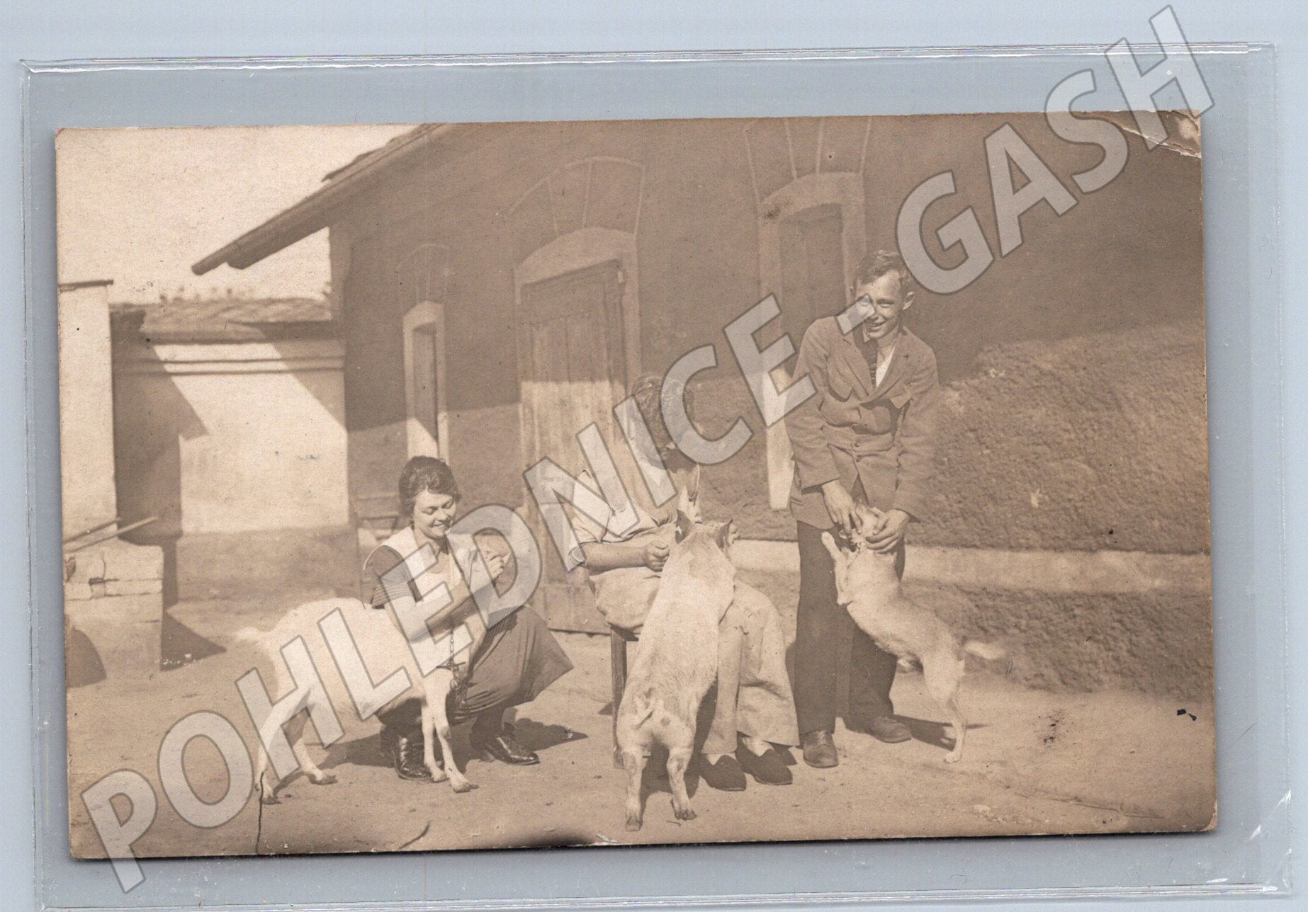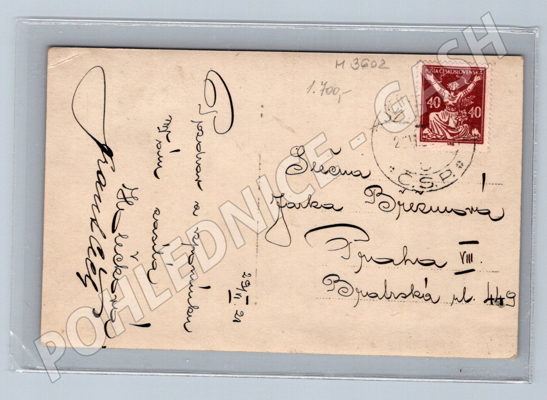 Starší černobílá pohlednice zobrazující dvě ženy a muže na venkovském dvoře, ve společnosti tří koz. Pohlednice je vyplněna a prošla poštou, na zadní straně je známka 40 haléřů a rukopisné věnování adresované slečně Jarušce Březinové do Prahy. Viditelné stáří a lehké opotřebení, pravý horní roh na přední straně je nepatrně ohnutý. Pohlednice krásně zachycuje venkovský život a vztah lidí k domácím zvířatům. Vhodná do sbírky starých pohlednic, nebo jako zajímavý dárek milovníkovi koz.