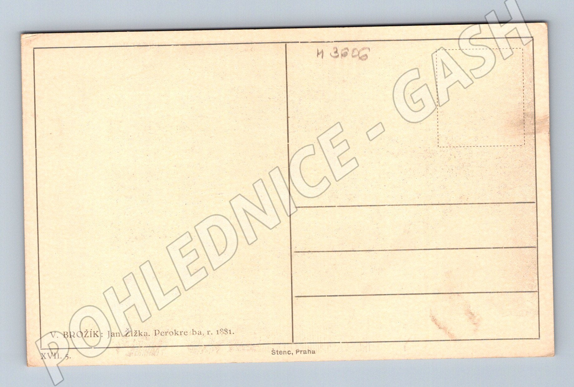 Originální stará pohlednice s perokresbou slavného českého vojevůdce Jana Žižky, autorem kresby je V. Brožík a byla vytvořena roku 1881. Pohlednice zachycuje historickou postavu v dobovém oblečení, výrazné detaily zbraní a výzbroje, scéna je laděná do černobílého tónu. Na zadní straně je uvedeno jméno autora a popis. Jedná se o zajímavý sběratelský kousek dokumentující českou historii a etnografii. Vhodné pro sběratele historických nebo tematikých pohlednic.