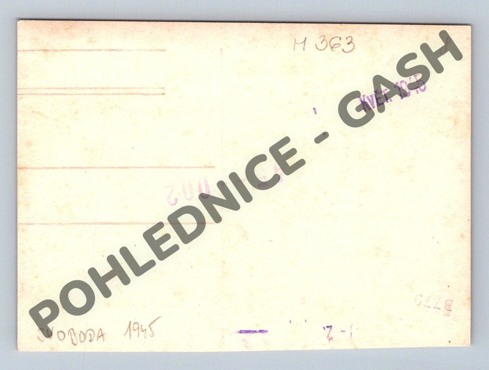 Originální černobílá pohlednice malého formátu zobrazující oslavy osvobození v Praze v květnu 1945, zachycené na Staroměstském náměstí, v pozadí s Týnským chrámem a okolní historickou zástavbou. Na přední straně pohlednice je patrný dav lidí a skupiny osob na pomníku. Zadní strana obsahuje ručně a razítkem přidané nápisy SVOBODA 1945, KVĚT. 1945 a inventární číslo. Pohlednice nese výraznou atmosféru konce druhé světové války a historického okamžiku v Praze. Stav odpovídá stáří, místy stopy opotřebení a lehké ohyby.