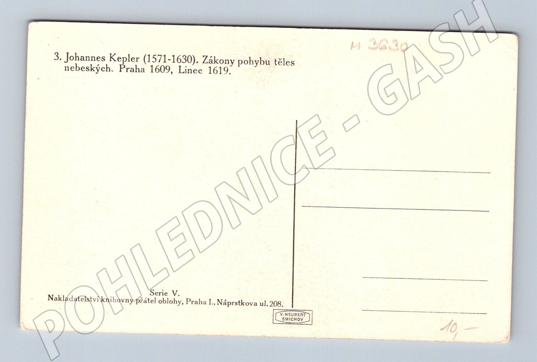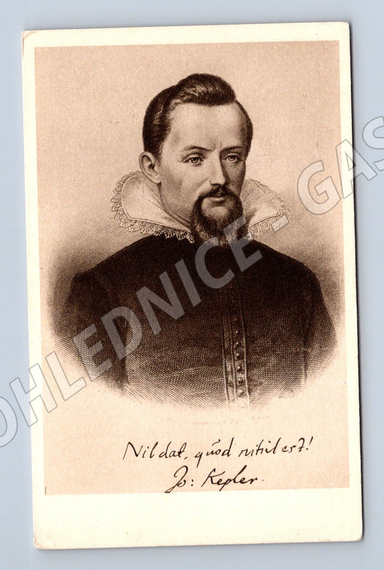 Originální stará pohlednice s portrétem slavného astronoma a matematika Johannese Keplera (1571–1630). Na přední straně se nachází vyobrazení Keplera s jeho vlastnoručním citátem v češtině: Nildat quod intus est! Jo: Kepler. Zadní strana je nevyplněná, tisková poznámka uvádí jeho přínos k zákonům pohybu těles nebeských a důležité roky (Praha 1609, Linec 1619). Nakladatel: knihovna přátel oblohy, V. Neubert Smíchov. Pohlednice je ve velmi dobrém stavu, vhodná pro sběratele historických osobností a vědeckých velikánů.