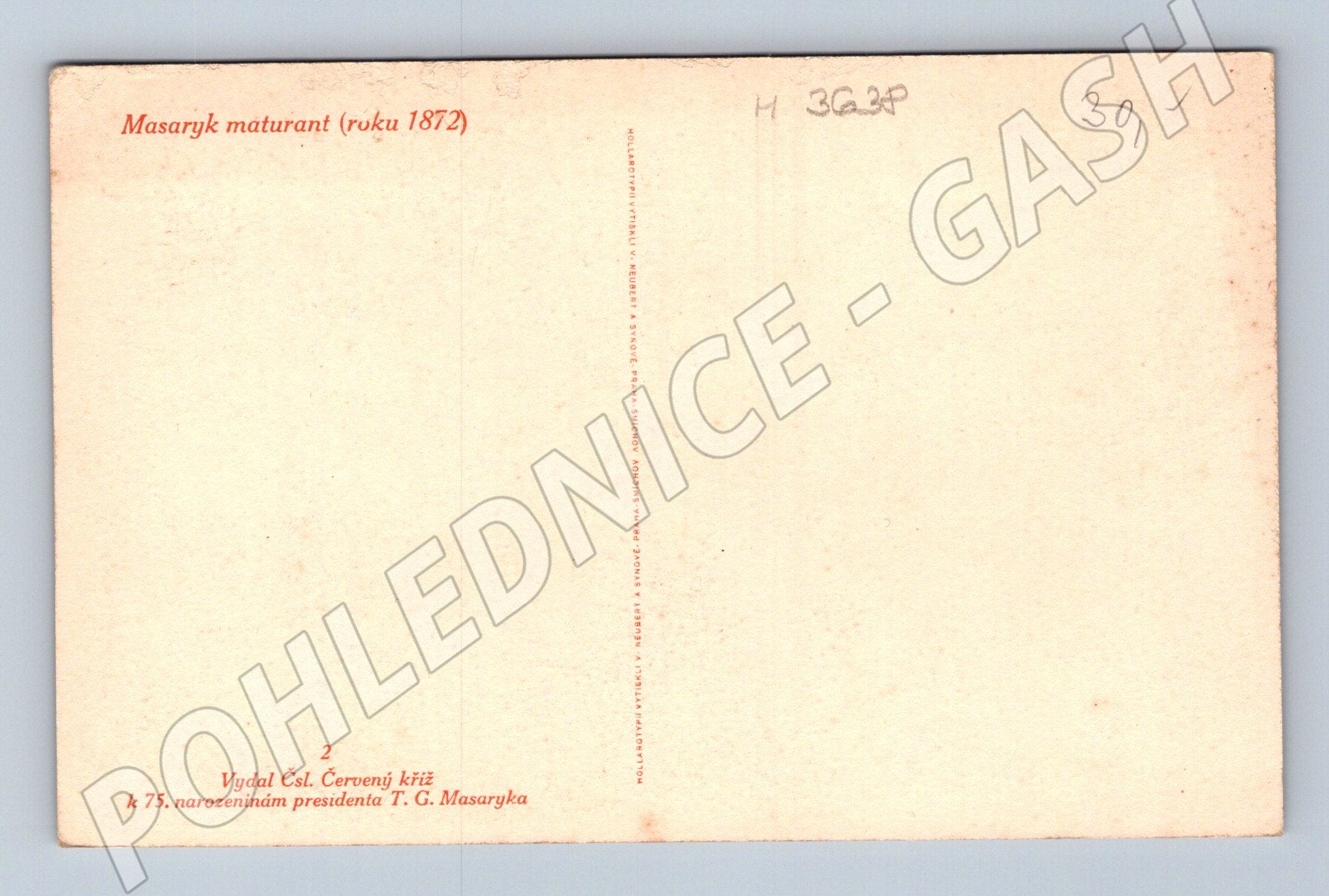 Historická pohlednice vydaná Českým červeným křížem k 75. narozeninám prezidenta T. G. Masaryka. Na pohlednici je portrét mladého Tomáše Garrigue Masaryka jako maturanta v roce 1872. Zadní strana nese nápis Masaryk maturant (roku 1872) a editační informace. Pohlednice je velmi dobře zachovalá, bez výraznějších poškození, vhodná pro sběratele či zájemce o českou historii a osobnosti.