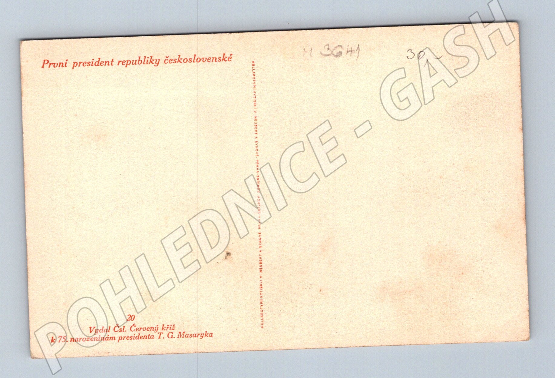 Originální historická pohlednice vydaná Červeným křížem k 75. narozeninám prezidenta T. G. Masaryka, prvního prezidenta republiky Československé. Na pohlednici je černobílý portrét T. G. Masaryka, významné osobnosti československé historie. Text na zadní straně obsahuje specifikaci vydavatele a účelu tisku. Pohlednice je ve velmi dobrém sběratelském stavu s drobnými známkami staří, neprošlá poštou. Významný pamětní tisk pro sběratele historických pohlednic a zájemce o dějiny Československa.
