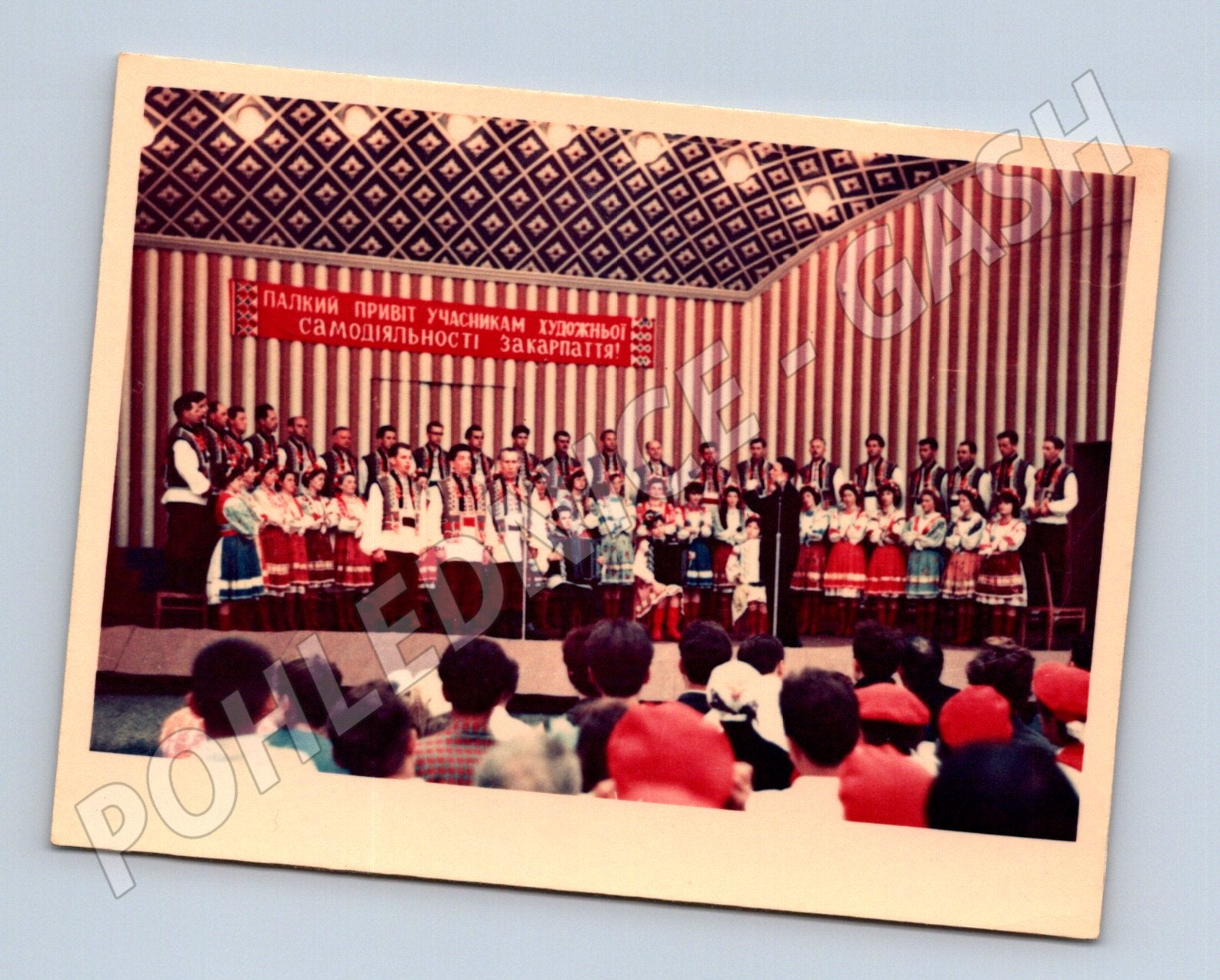 Barevná pohlednice zachycující folklórní vystoupení v Kyjevě z 20. února 1965. Na fotografii je skupina zpěváků a účinkujících v tradičních ukrajinských lidových krojích stojících na pódiu před publikem. Výrazné lidové motivy na oděvech a doplňcích jsou ukázkou etnografických tradic Zakarpatské oblasti. Kulisa je ve stylu lidové architektury s typickou ornamentikou. Nápis v ukrajinštině na pódiu poskytuje přivítání účastníkům umělecké samostatnosti Zakarpatska. Pohlednice má ručně psaný popis na zadní straně s datem a místem konání akce. Skvělá sběratelská ukázka ukrajinské folklórní kultury 60. let.