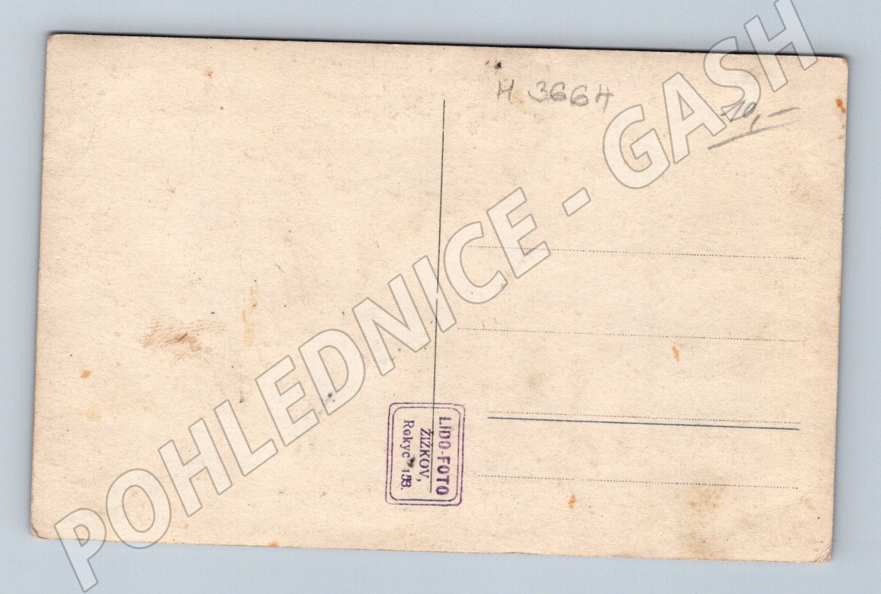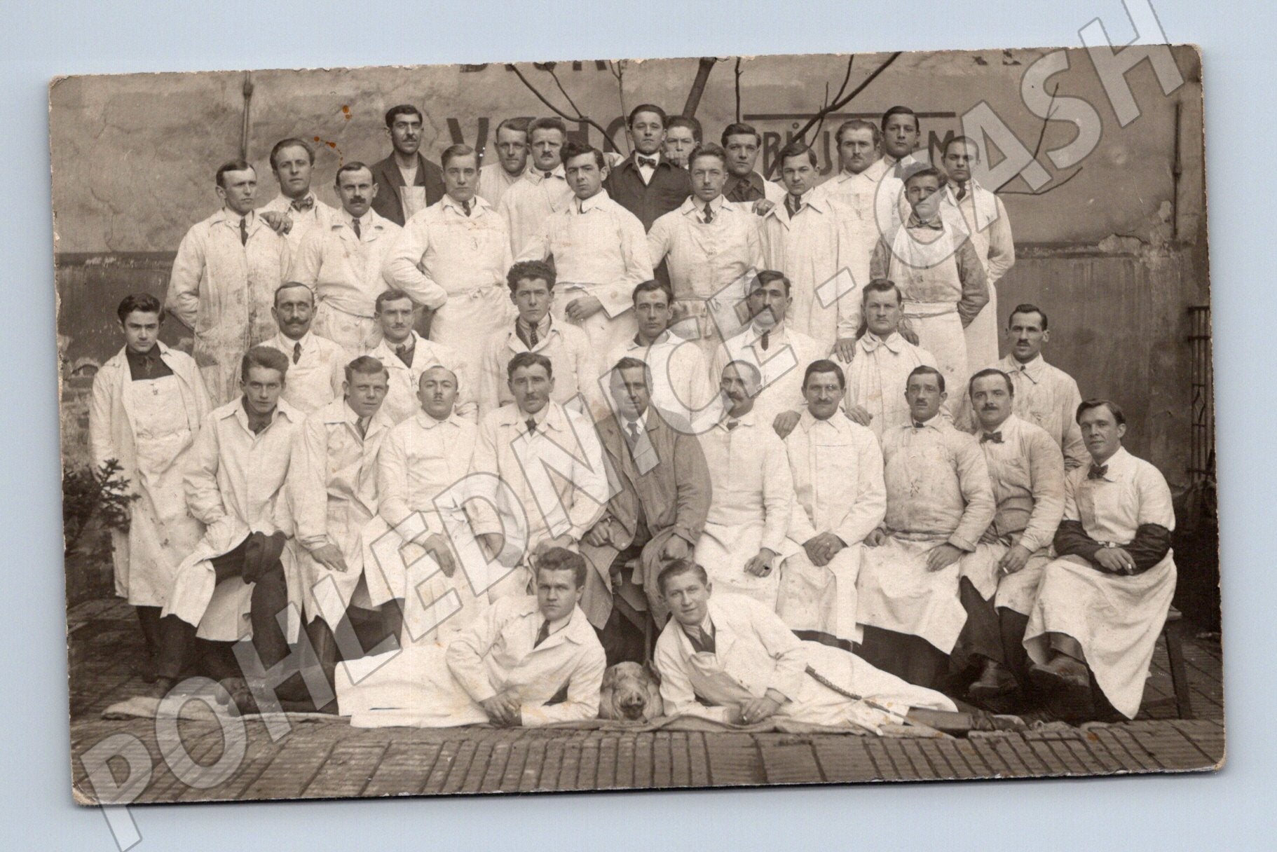 Originální historická pohlednice menšího formátu z období před rokem 1950. Na fotografii je početná skupina mužů v bílých pláštích, pravděpodobně zaměstnanci řeznictví. Foto je aranžované před zdí s výrazným nápisem. Na zadní straně pohlednice je text a razítko ZZKOV, Roháč 713, ROHO-FOTO . Pohlednice je ve velmi dobrém sběratelském stavu s jemnými stopami stáří. Skvělý přírůstek do sbírky historických fotografií či pohlednic z Československa.
