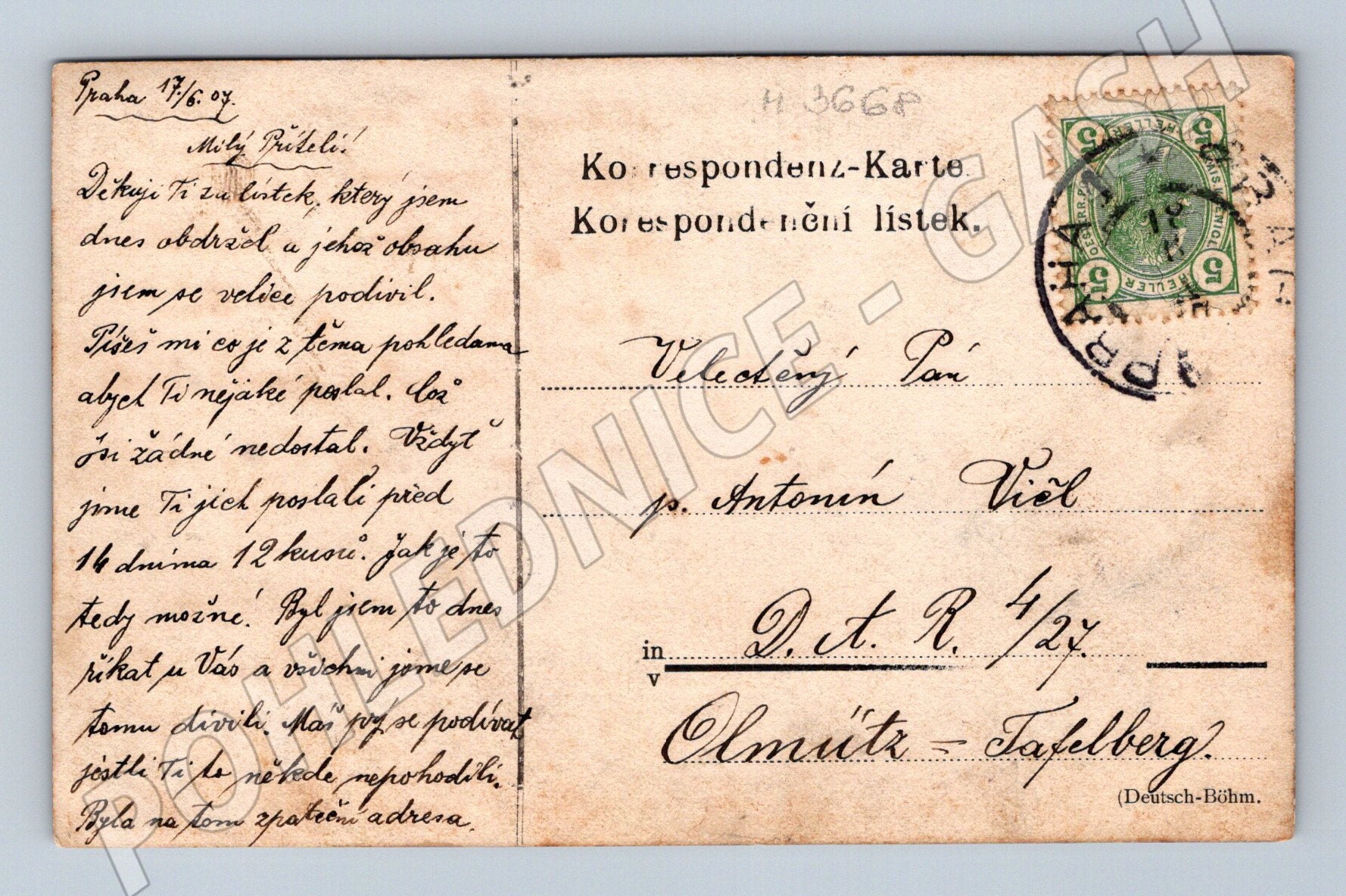 Starobylá pohlednice z období Rakousko-Uherska, odeslaná z Prahy roku 1907. Pohlednice má typický malý formát a na lícové straně je fotografie dvojice v dobovém oblečení. Zadní strana obsahuje vyplněnou korespondenční zprávu s čitelným datem 17. 6. 07 a adresou v oblasti Olomouc – Tafelberg (dnes známé jako Tafelberg, Německo-česká oblast). Pohlednice byla přepravena s rakouskou poštovní známkou v hodnotě 5 hellerů. Jedná se o krásný sběratelský kus s autentickým rukopisem, stářím přes 115 let, vhodný pro milovníky historie, korespondence či regionálních pohlednic z území dnešní České republiky. Stav: odpovídající stáří, místy lehce zašpiněná, okraje se stopami používání. Originální dobová fotografie a zajímavé poštovní razítko.