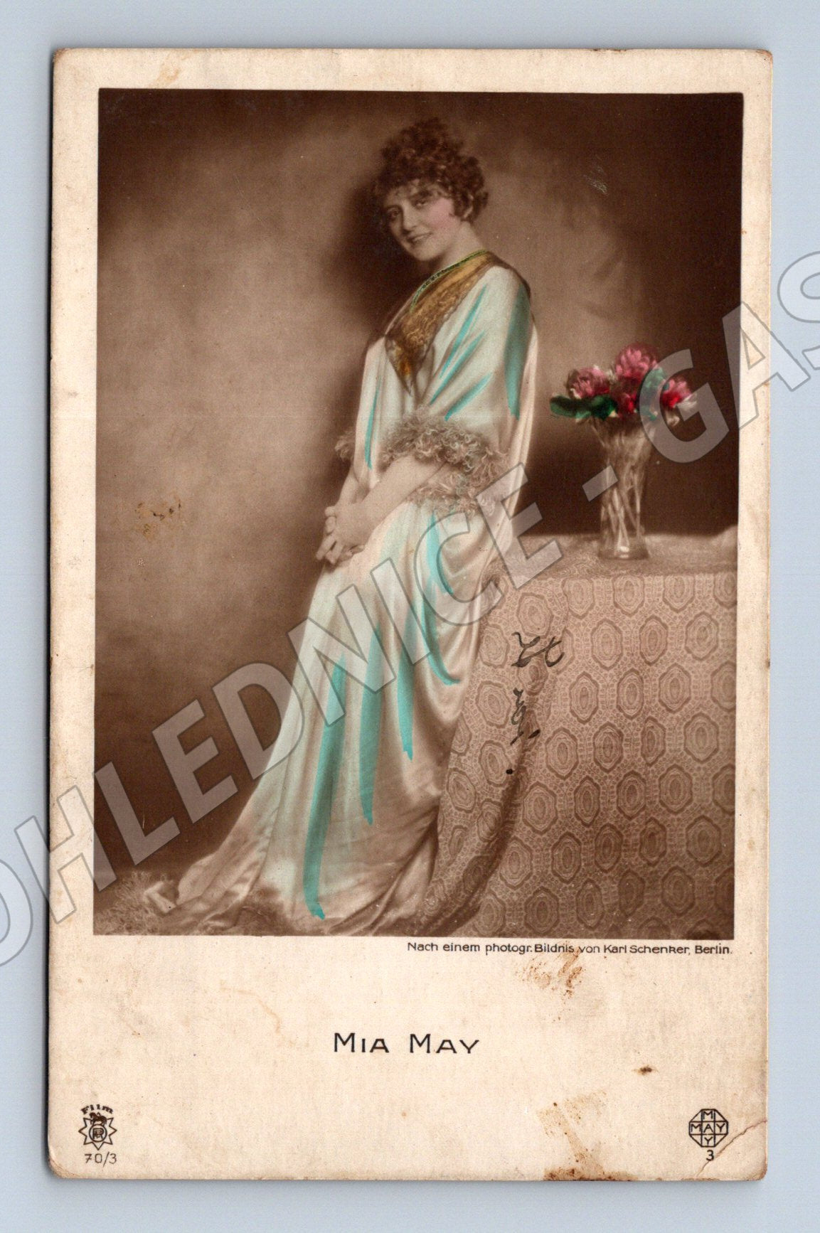Originální stará pohlednice zachycující herečku Miu May. Jedná se o černobílou pohlednici s ručním kolorováním šatů, vydanou ve spolupráci s berlínskou fotografickou studií. Na pohlednici je jasně uvedeno jméno herečky.