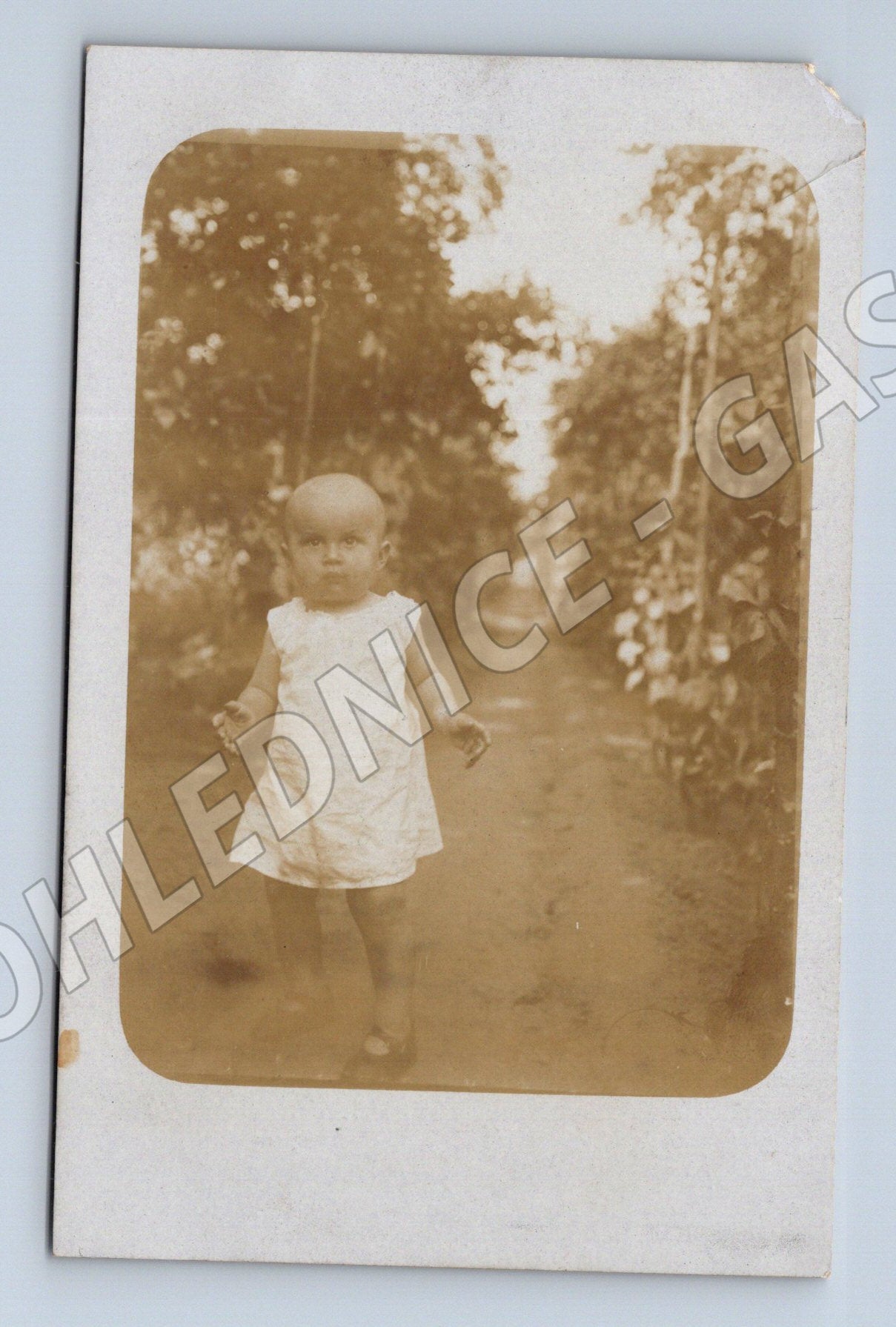 Starodávná pohlednice – portrét dítěte, černobílá, malý formát